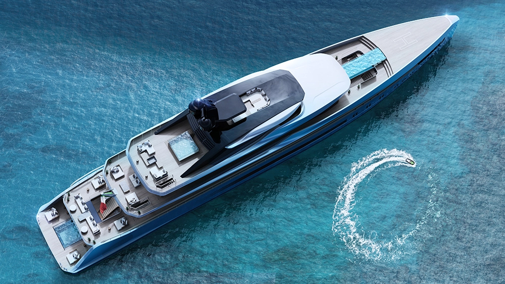 Project Fox’s 1,200-square-foot rear deck can hold amphibious vehicles, submersibles, Jet Skis, a pair of 25-foot tenders and scuba gear; with clear decks, it becomes a sprawling social area. Fittingly, the yacht will also come equipped with a DJ booth, a wine cellar, a media sky lounge and a dedicated barbecue space.