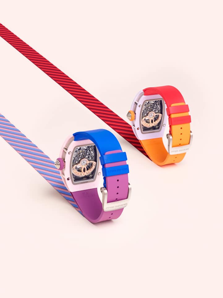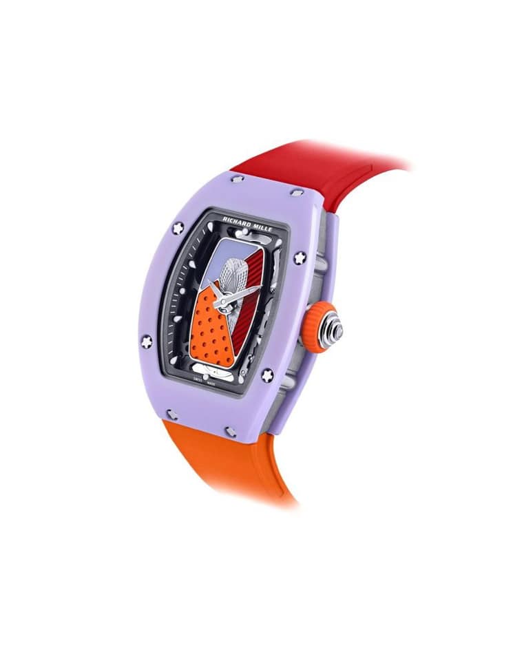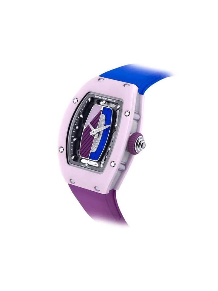 Surrounding the guilloché dial segment and reinforcing the theme of modernity blended with tradition, are geometrically shaped elements of ceramic and rubber, in perfect complement with the ceramic case and bi-colour rubber straps. There are three colour variations within the RM 07-01 Coloured Ceramics collection, TZP pink ceramic with cerulean-lilac rubber strap, TZP lavender ceramic with coral-tangerine rubber strap, and TZP blue ceramic with olive-aqua rubber strap. In deciding on the colours and textures of these new models.