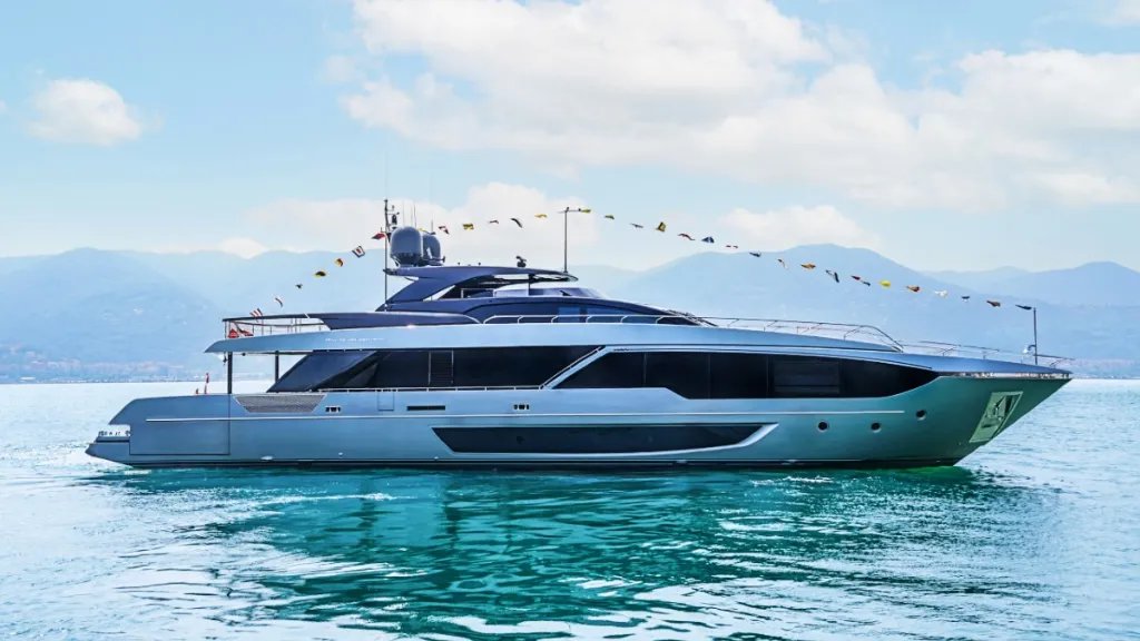 The sleek profile of the latest in Riva’s superyacht series is part of the brand’s DNA and quite different from the 110-foot model launched in 2018. But the experience is more about how the designers recreated the space, both inside and out. The 635-foot rear cockpit includes a beach club that encompasses about half of the total area. It can be expanded via bulwarks that create side terraces beyond an already generous 23’5" beam, turning it into a platform near the water. Above, the flybridge measures an even more impressive 660 square feet, and is divided into a rear social area with loose furniture (it can be cleared to make a dance floor), a mid-deck cocktail bar with stools and a retractable television beside a central lounge. The interior has two possible layouts—one with the dining area aft near the cockpit and a lounge in the center, or a more conventional configuration with the dining area in the center. The full-beam owner’s suite has twin walk-in closets along with large wide windows to enhance the natural light. Its twin 16V 2000 MTUs deliver a top end of 25.5 knots.