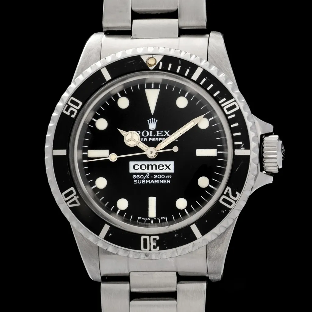 นี่คือตัวอย่างที่โดดเด่นของหนึ่งในนาฬิกาดำน้ำ COMEX ที่หายากที่สุดที่เคยผลิตมา นั่นคือ Submariner เรฟ 5514 ซึ่งสร้างขึ้นจากรุ่น 5513 ที่วางขายทั่วไป (สลักอยู่ที่ฝาหลังด้านใน) เรฟเฟอเรนซ์นี้มีลักษณะเด่นคือตัวเรือนที่ได้รับการดัดแปลงเพื่อติดตั้งวาล์วปล่อยเฮเลียม การกันน้ำยังคงอยู่ที่ 200 เมตร ซึ่งอาจฟังดูไม่น่าประทับใจเมื่อเทียบกับนาฬิกาหลายรุ่นที่มีอยู่ในปัจจุบัน แต่ก็เพียงพอสำหรับการดำน้ำเกือบทุกสถานการณ์ แม้ว่าจะเป็นระดับงานที่สูงมาก