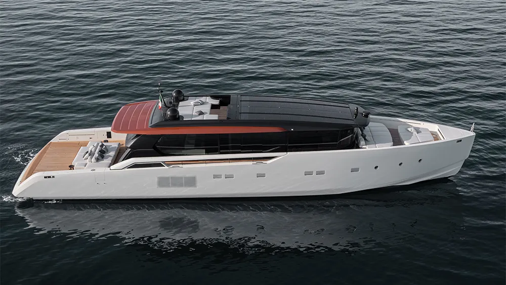 In profile, the SP110, the first of the Italian builder’s Smart Performance series, looks squat, even slightly misshapen. But the interior’s interconnected jigsaw shows real genius. The design team’s goal was to redefine the way people live on their boats. The rear entrance is split-level, with the lower section an open-air salon featuring a video wall, lounges, and access to four staterooms. Steps up is a second social area, but open and longer, with couches at one end and an informal dining table at the other. Windows on three sides provide exceptional views, especially from the rear, which has the design feel of a Manhattan penthouse.