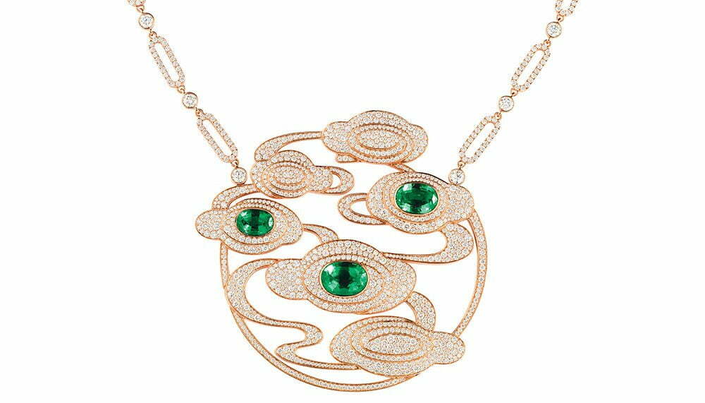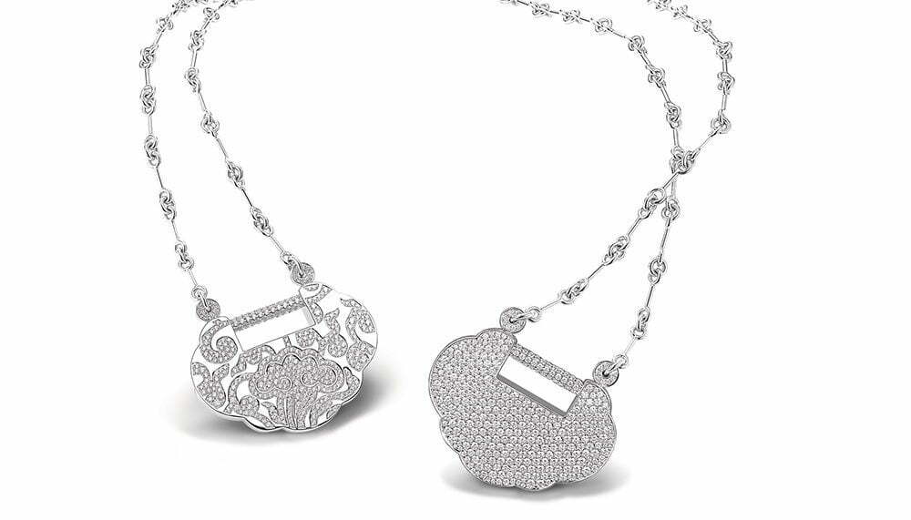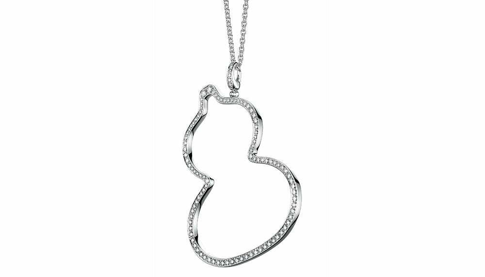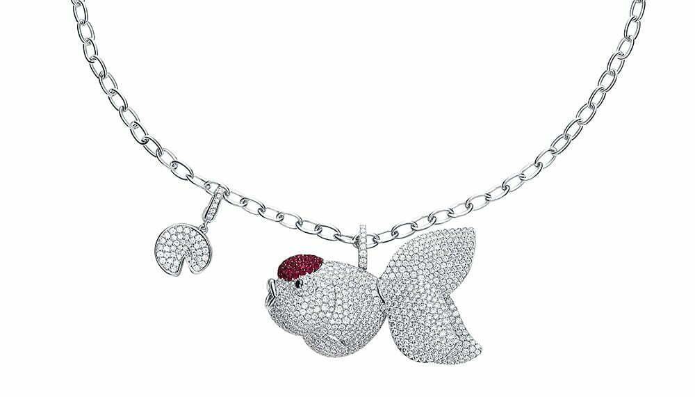 The brand’s breadth of offerings, priced from US$1,000 to US$300,000, spans 12 themed collections, as well as watches and accessories. Pieces include those in the Wulu collection, which is based on a figure-eight-shaped gourd that signifies good fortune and positive energy. Chan referred to the hard-shelled fruit years ago in his first design, and today it appears in many of his creations, including a diamond-and-ruby ring with a top that the wearer can spin like a dial. For the Yu Yi collection, he has transformed the traditional locket that new parents in China often place on their newborns into a gold pendant necklace bearing a diamond-studded cloud pattern. Chan has also given new life to the familiar dragon-and-phoenix image with his elaborate gold-and-diamond two-headed bangle; and pieces in his playful goldfish collection, called Qin Qin, include earrings and rings covered in black and white diamonds.