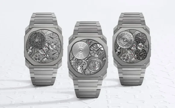 In a literal translation of the concept of the flagship, this schooner under full sail represents the brand’s historic boutique at 24 Rue du Faubourg Saint-Honoré in Paris—the good ship Hermès. Crafts include engraved yellow gold and miniature painting against an aventurine background. For fun, a star at 4 o’clock spins with the wrist movements. It is based on a scarf design by Dimitri Rybaltchenko and represents “the poetic universe navigating between the imaginary and the real." Rose gold, gemset $99,200. White gold gemset: $144,200. 12 pieces each.