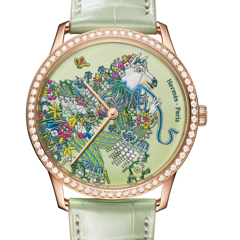 This is one in a series of four pieces (shown below), each representing a season and created using paillonné enamel, engraving and/or miniature painting. All are drawn from an Hermès silk scarf designed by artist Pierre Marie that depicts animals. Spring is a micro-painted horse surrounded by flowers rendered in lovely pale green. Prices range from $84,500 to $126,800. 12 pieces each.