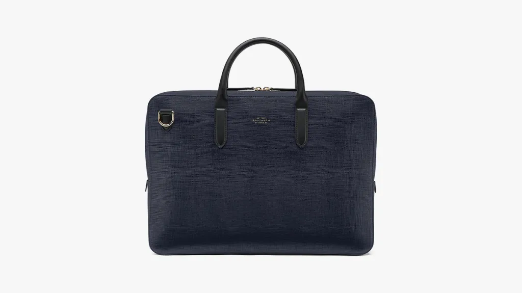 Smythson’s deep-blue leather is truly eye-catching. Renowned for exquisite stationery, this English brand also crafts coveted luxury leather goods, and their sleek and stylish Panama briefcase, crafted in said blue, features their signature cross-grain texture. This chic briefcase is for the modern Renaissance man who takes his style as seriously as his profession.