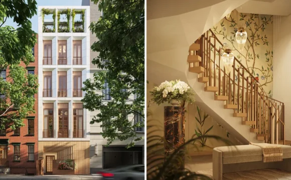 Wood-trimmed picture windows that extend all the way to the ceiling line two walls of the great room, offering impressive views in every direction as well as access to the terrace. Clever design choices are everywhere, like the built-in bookshelves in the library, a custom cabinet in the living room that’s adorned with decorative wallpaper and hides the television, and a carefully fitted walk-in closet. Among the premium amenities are a private elevator, an onsite spa with a sauna and an outdoor jacuzzi, and two dedicated parking spaces.