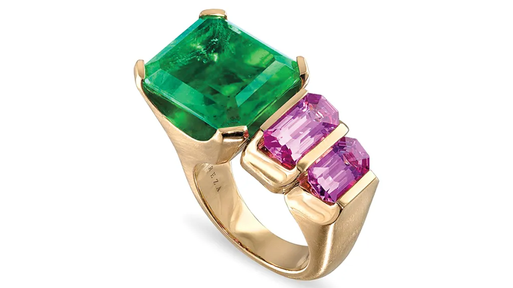 For decades, Reza has been revered for its extraordinary colored gemstones. Under the creative direction of Olivier Reza, son of the late founder Alexandre Reza, the maison is entering a bold new chapter—infusing its storied legacy with a fresh, contemporary spirit. Case in point: this striking ring, which masterfully balances color, proportion, and modernity. At its heart is a magnificent 11.67-carat Colombian emerald, flanked by two pink sapphires of 1.71 and 1.39 carats, respectively. The lively trio is set in a mix of brushed and high-polish 18-karat yellow gold. Reza describes the pairing of vibrant green and delicate pink as an “unexpected harmony"—and it’s easy to see why. Adding to its allure, the emerald is positioned to nestle between the fingers, creating the illusion that the stone floats gently in place.