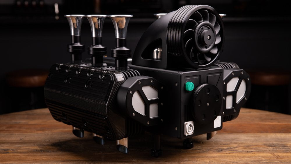 Weighing at 47 pounds and requiring 15 inches of counter space, the machine is handcrafted using aerospace-grade materials, including surgical stainless steel, titanium, and carbon fiber, and mimics the engine with its top-mounted cooling fan and six stylized air intakes. Only 993 examples are being offered, each priced at roughly $11,900.