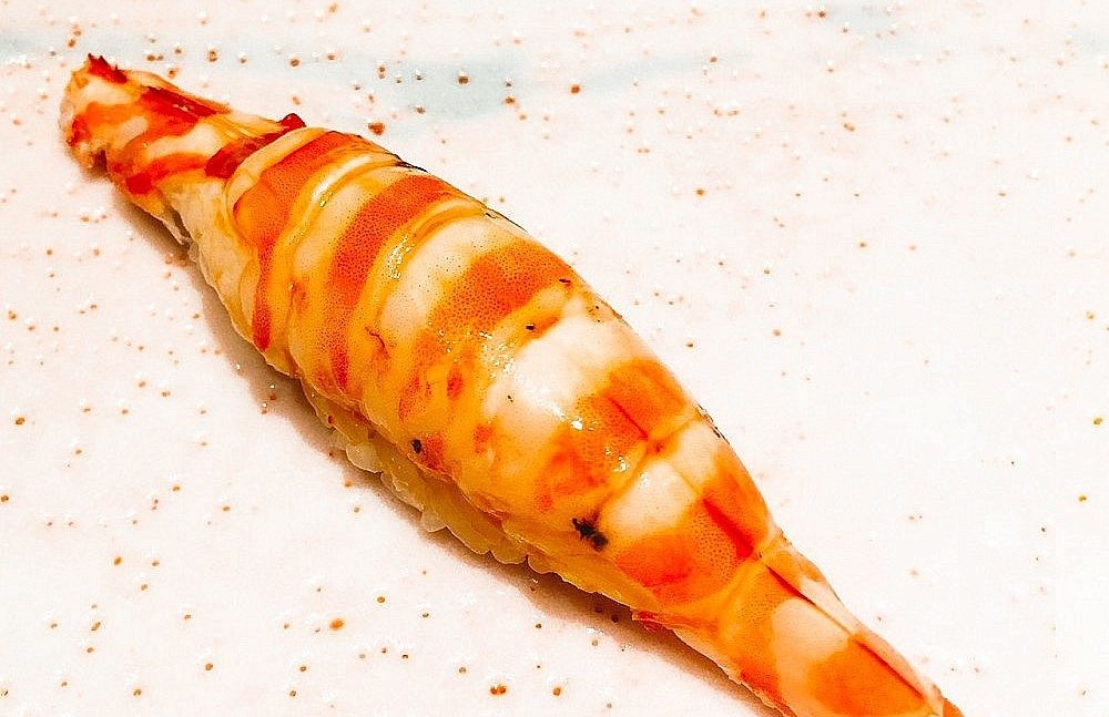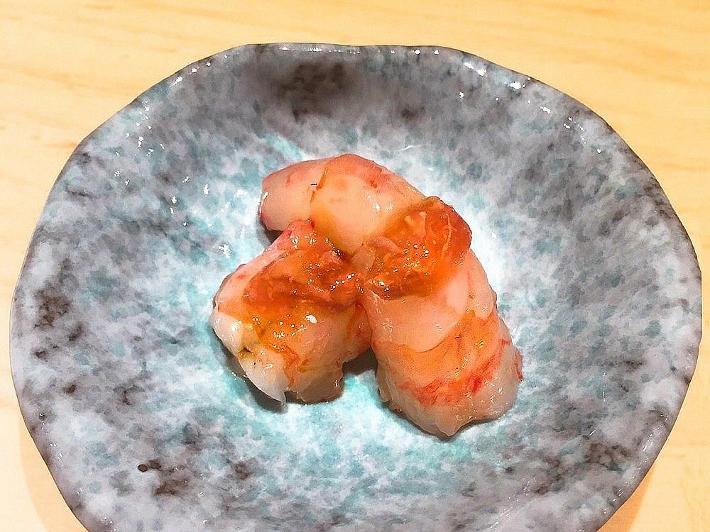 Before he serve us the first sushi , he presents us a beautiful piece of bluefin tuna, the Hokkaido hairy crab and plump abalone which will be the star of the omakase menu tonight. An edamame amuse bouche is swiftly followed by botan ebi (shrimp) with shiokara sauce. The ebi are seashore fresh and the sauce compliments the natural sweetness of the shrimp. Next up is the abalone, poached for 8 hours and served with a sauce that made from stewed abalone liver. I first try a piece without the sauce. It is cooked perfectly. The sauce, again, is exquisite. After you finishing the abalone, Chef Toda offers guests a luscious bite of sushi rice, soaked in the sauce so it takes the aspect of risotto. The taste of the rice combined with the sauce brings out a velvety creaminess underwritten by umami . It is grin-makingly gorgeous. His abalone dishes, however, are the “stand out “pieces. I wish I could ask for more but this is just the start and there is much more to come.