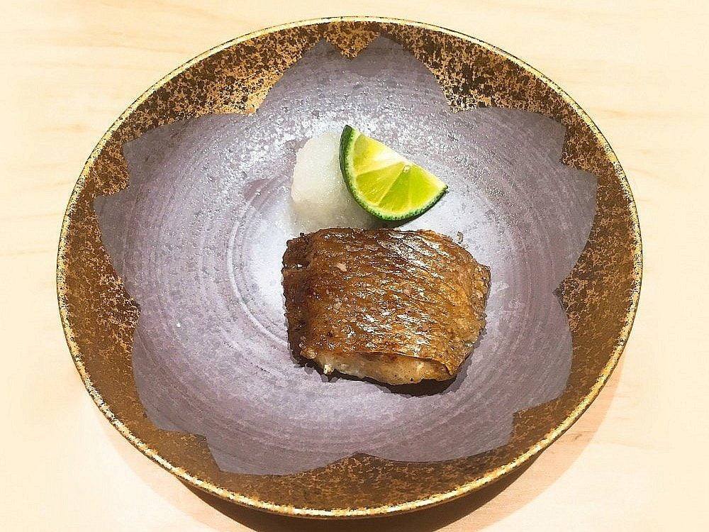 The omakase at Ichizu varied from night to night, but is likely to include at least some of the beautiful bites we enjoyed. Among these one should mention the grilled nodoguro (rosy seabass) that smells so good with fatty tender meat that tastes just wonderful, as well as the myriad nigiri ; shinko (the youngest fish under 5 cm), kohada (the slightly more mature fish around 10 cm), shinika (small octopus) , kasugo tai ( baby seabream), kuruma ebi ( tiger prawn) , kinmedai ( golden eye snapper), akami (lean tuna) and o- toro. Alongside the nigiri, Chef Toda serves chawanmushi ; a Japanese style steamed egg, prepared here with shark’s fin.