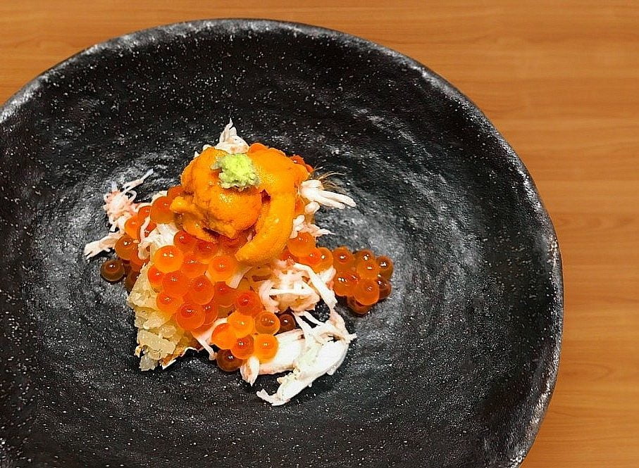 Next up is uni (sea urchin) and this is worth explaining. Uni, at any distance from the beach, can be a challenge. That those served at Sushi Ichizu match the best available anywhere is testament to the care taken to the source, treat and honour the ingredients. The Hokkaido hairy crab is further evidence of this. It looks like it only just emerged from the sea. Though between its initial appearance and entry to the menu it has gained a beautiful rice topped shell, adorned with bafun uni (the edible orange lobes of the sea urchins). Along with this come Asari (clam soup) that soothes my throat a perfect hearty way to finish. To clean the palate before dessert, Chef Toda offers seaweed rolls (using top quality seaweed from the Ariake Sea) and a spongy, cheese cake-like tamago (grilled egg). Dessert consists of a freshly prepared warabi mochi topped with korumitsu syrup (sugar syrup similar to molasses but thinner and milder). It is a surprisingly sweet note to end the night and Chef Toda makes me crave this dessert, so I shall definitely have to come back again soon.