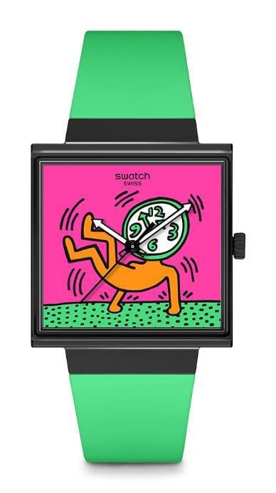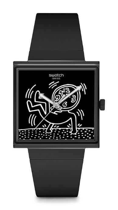 นาฬิกาในคอลเลกซันนี้เป็นนาฬิกาตระกูล BIOCERAMIC WHAT IF? ตัวเรือนและหน้าปัดรูปทรงสี่เหลี่ยมมอบพื้นที่แสดงฝีมือการออกแบบได้เป็นอย่างดี ด้วยวัสดุสมัยใหม่นี้รับประกันได้ว่านาฬิกา Swiss-made ที่กันน้ำได้นั้นให้ความรู้สึกเบาและสวมใส่สบาย รวมถึงมีสีสันสดใสและสะดุดตา เช่นเดียวกับนาฬิกาในตระกูล BIOCERAMIC WHAT IF? ทุกรุ่น ที่มีดีเทลลับซ่อนอยู่ตรงฝาครอบแบตเตอรี่ด้านหลังของตัวเรือน สำหรับรุ่นนี้ก็คือโลโก้ Swatch อันโด่งดัง ที่วาดโดย Keith Haring จากโปสเตอร์ออริจินัลนั่นเอง