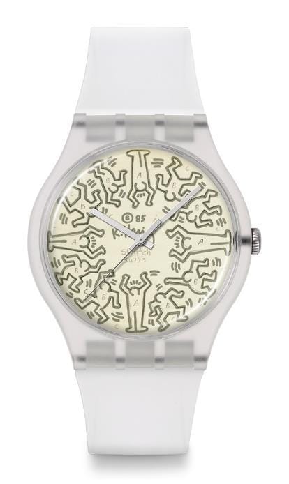 ปรากฏตัวอีกครั้งบนหน้าปัดของนาฬิการุ่น NEW GENT BIOSOURCED ขนาด 41 มม. สามารถมองเห็นเส้นสเก็ตด้วยดินสอและข้อความได้อย่างชัดเจน ถึงแม้ว่าจะมีการเน้นขอบด้วยหมึกเข้มแล้วก็ตาม แม้กระทั่งรายละเอียดสำคัญอย่างการเขียนคำว่า Swatch และ Swiss ที่เป็นลายมือของ Keith Haring ซึ่งล้วนเป็นการสื่อถึงความสม่ำเสมอของมาตรฐาน Swiss- made ที่กันน้ำได้ เช่นเดียวกันกับรุ่นที่ผลิตตั้งแต่ปี 1986 มาพร้อมกับสายนาฬิกาซิลิโคนโปร่งใสที่ทำให้ใส่สบายสุดๆ ไม่ว่าจะเลือกสวมแบบใดก็ตาม