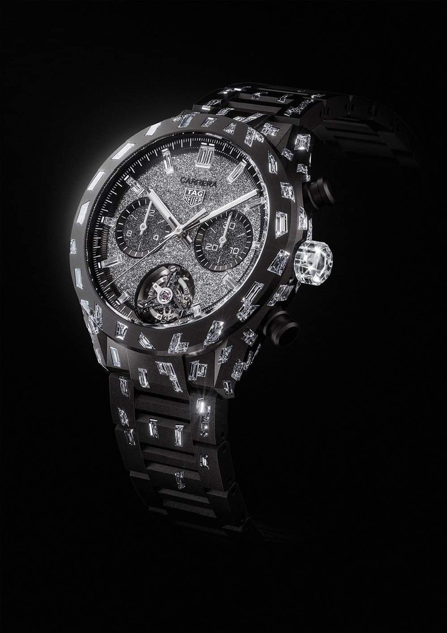เมื่อปีที่แล้ว TAG Heuer ปฏิวัติความเป็นไปได้ของการออกแบบเคสด้วย Plasma Tourbillon Chronograph เป็นตัวเลขหกหลัก ซึ่งเป็นห้องทดลองด้านกีฬาที่ปลูกเพชรและปรับแต่งในรูปทรงต่างๆ รวมถึงแบบที่ดูเหมือนจะหล่นลงมาเหนือขอบของนาฬิกา เช่นเดียวกับบนหน้าปัด เม็ดมะยม และดัชนี เพื่อเป็นการติดตามผล นาฬิการุ่นปีนี้จะมีเพชรขยายออกไปอีกตลอดสายของนาฬิกา