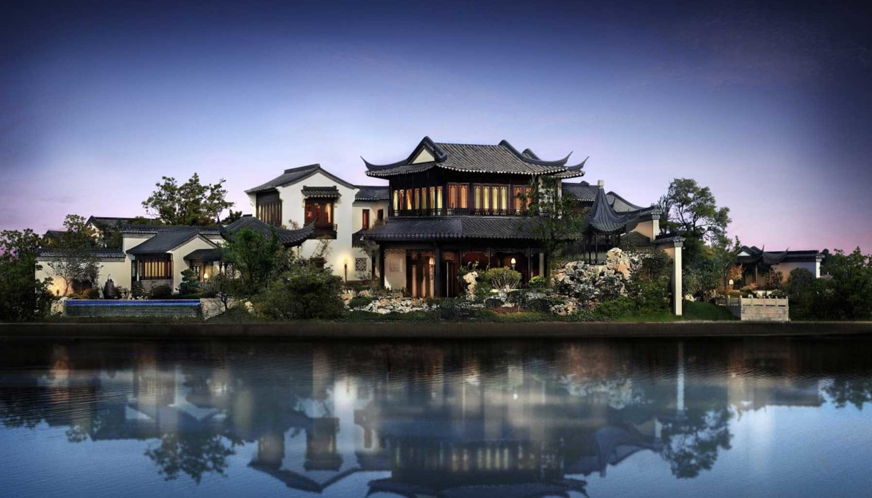 Situated on a private island at the heart of Suzhou’s Dushu Lake (China’s largest), the posh compound is considered highly desirable because its location and shape are in line with the laws of feng shui. Inspired by the city of Suzhou – a maze of waterway canals, leafy gardens, and zigzag bridges – the classic Chinese estate took three years to complete and features 32 bedrooms and 32 bathrooms. Outdoor pavilions overlook the lush grounds that were modeled after the Classical Gardens of Suzhou, a UNESCO World Heritage Site, and are teeming with native plants, craggy rocks, reflection pools, and a bubbling waterfall.
