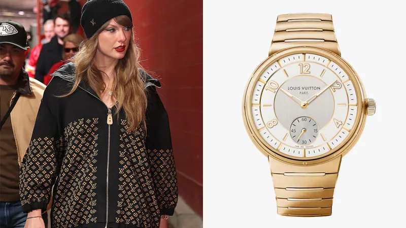 Singer and songwriter Taylor Swift is rarely seen wearing a watch, but when she does, everyone notices. She was recently spotted in Kansas City, Missouri, wearing a Louis Vuitton Tambour timepiece in yellow gold. She was at Arrowhead Stadium watching the Kansas City Chiefs and the Denver Broncos keeping time on the game with her Louis Vuitton watch. The Tambour is a unisex timepiece that features Louis Vuitton’s first integrated bracelet, which blends seamlessly into the slim case. There is a range of different materials and colors to choose from, and Taylor Swift has gone for the yellow-gold version with a white dial, which you can purchase for around $54,000.