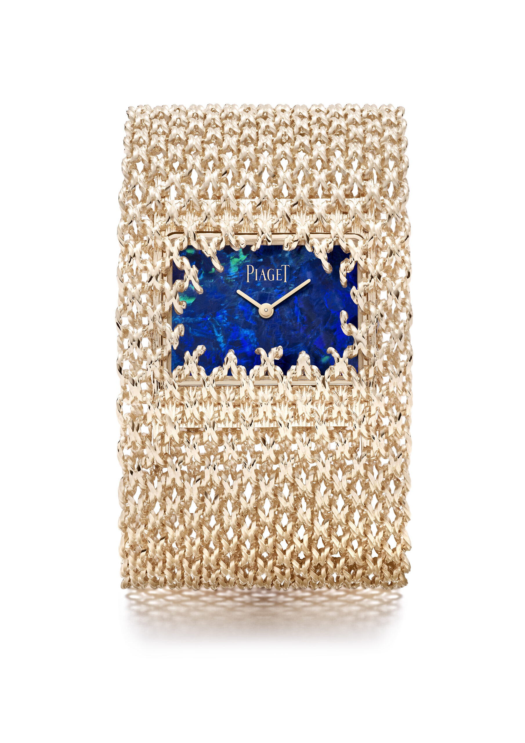 CUFF WATCH: 1969 also saw the introduction of the cuff watch, a boldly-scaled style that only continued to grow in exuberance and extravagance in terms of size and materials: deep cuffs of graphic gold openwork, heavily textured gold bracelets and vibrant coloured dials. So much so that the dramatic watches in the 21st century collection were hailed in the press as the watches ‘of the international elite.’ After the 2023 Hidden Treasures cuff was awarded by the GPHG’s Ladies Watch prize, the Maison is introducing this season another take on this icon. Here, the black opal dial swimming with iridescent greens and blues isn’t so much encased as it is revealed within its hand-made gold chain cuff, each twisted individually by hand, the goldwork seeming to grow organically over the dial, coral-like in its asymmetry. A masterclass in Piaget’s use of colour and textured gold.