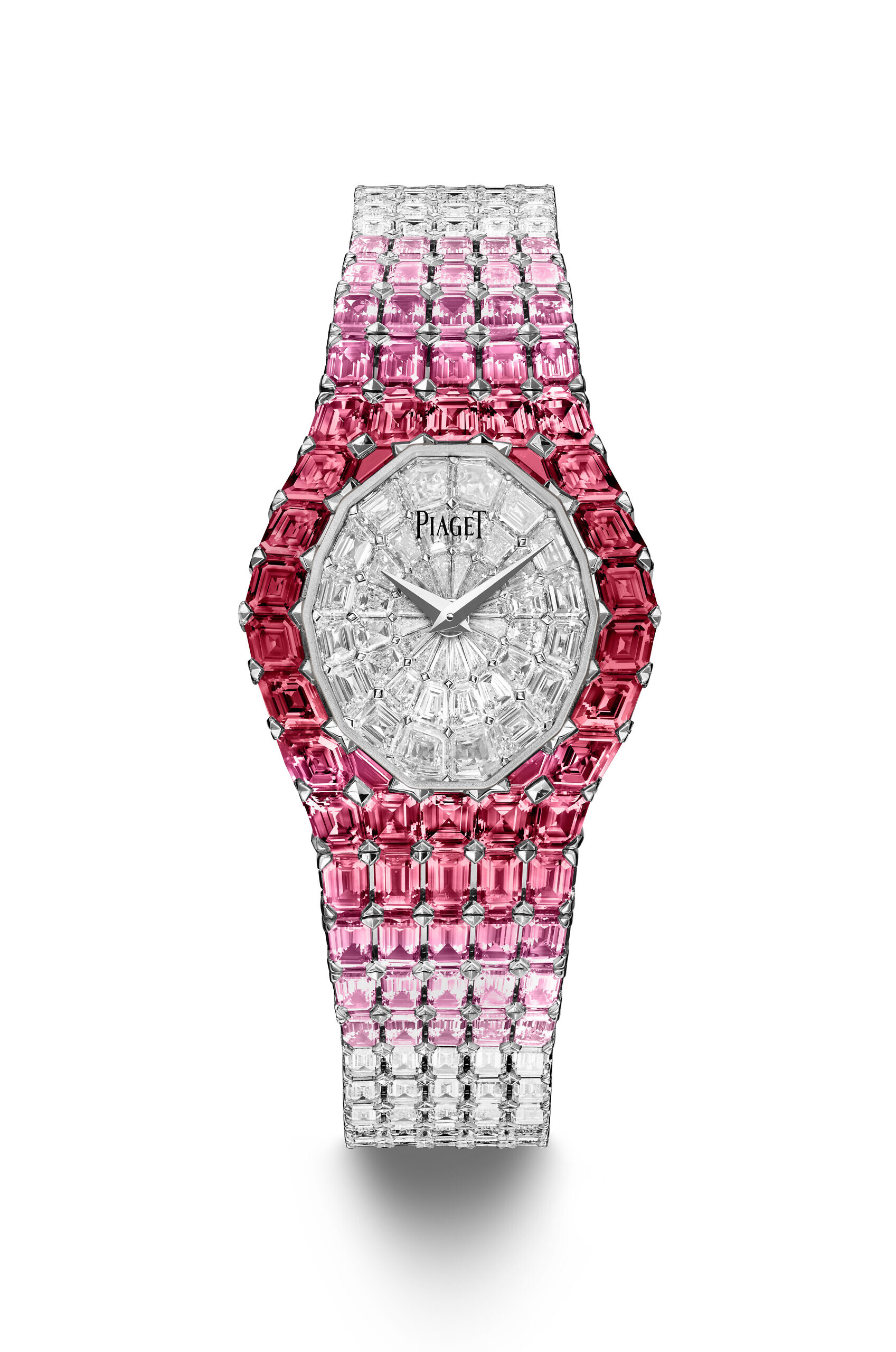 AURA: When the first High Jewellery Aura timepiece was revealed in 1989, it sparked a frenzy of enthusiasm for the daring nature of its seamless integration of its bracelet and case entirely paved with baguette-cut diamonds, proving Piaget’s prowess in gem-setting. Beautiful both in and out, this exceptional timepiece boasted an ultra-thin movement, the Piaget Manufacture Ultra-thin manual winding 40P, when most of the Maisons were using quartz movements for their precious watches. Now, for its 35th anniversary, the Maison celebrates this precious icon with the launch of two unique pieces set with beautiful hues of rubies, pink sapphires and diamonds. Masterful cutting and setting techniques allowed Piaget to create a face of thin rubies that radiate from the center of the dial, the colour deep and saturated and beautifully juxtaposed with baguette-cut diamonds. A beautiful gradiant of colours effect is expertly achieved in the second variation, with the deep red of the rubies imperceptibly fading through to softest pink sapphires and diamonds via Piaget’s incredible setting savoir-faire and colour matching. In two sizes, these audacious new additions to the Aura collection are at the very pinnacle of High Jewellery and Watchmaking.