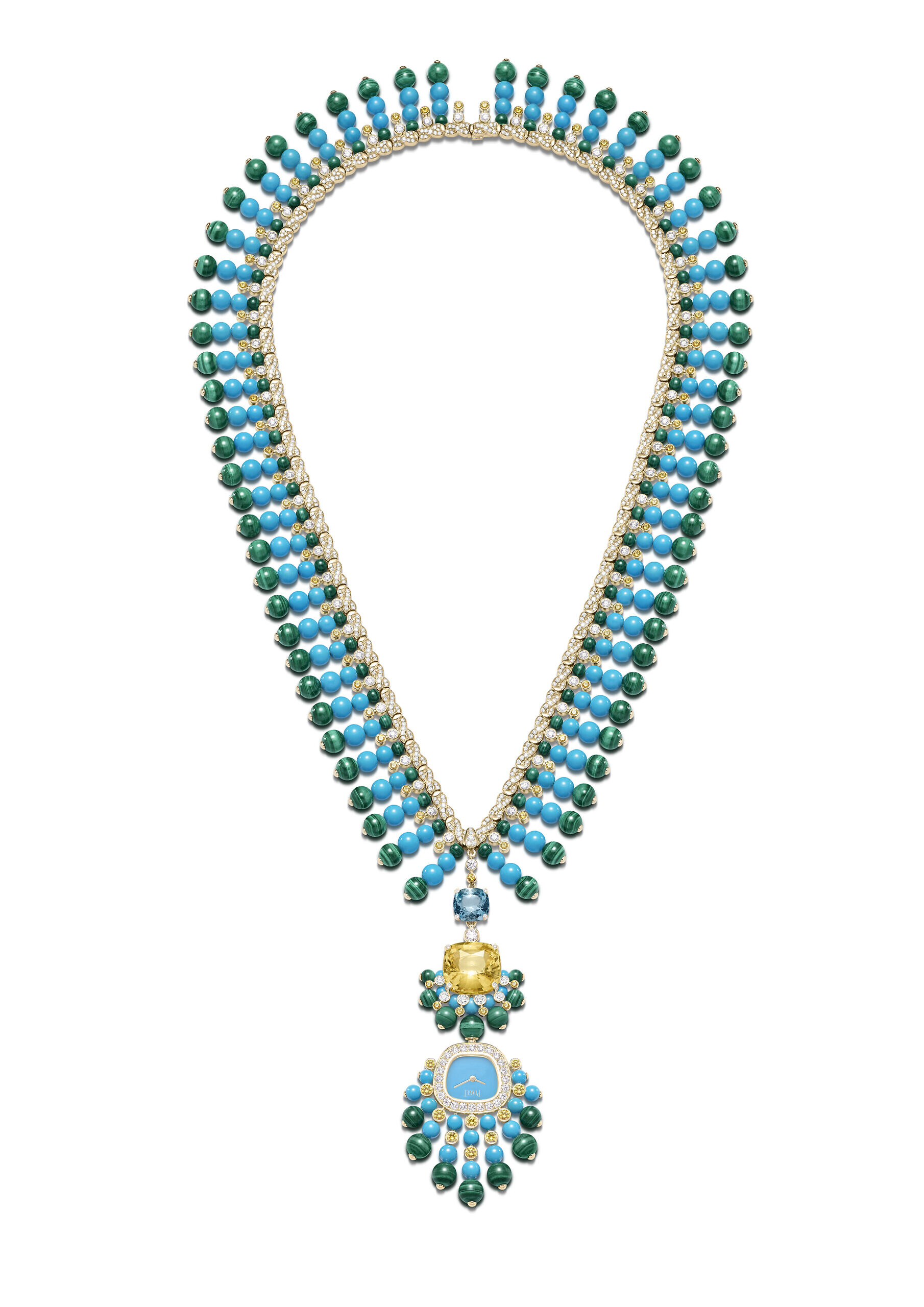 In 2024, Piaget unveils three exquisite new Swinging Sautoir, two transformable to be worn on the wrist. For the first one, the artisans created the twisted gold chains by hand, meticulously crafting single strands of gold into fluid links that fall harmoniously to be anchored with the timepiece. Each Swinging Sautoir case comes in a new, softly rounded trapeze case, a nod to the shape of the cases from the original 1969 collection. The Iconic 1970s-era colourway of blue and green is seen in a necklace of malachite and turquoise beads and flamboyantly radiating out from the diamond-paved set hand-twisted gold chain and interspersed with yellow sapphires and brilliant-cut diamonds. The turquoise dialled watch is suspended from a duo of precious gemstones – a rare and important 29.24-carat yellow sapphire from Sri Lanka, and a 6.11-carat aquamarine, elevating the Sautoir to a High Jewellery necklace that can be worn on its own, while its watch component can be ingeniously and effortlessly unclasped to be worn on a green satin strap – an example of Piaget’s playful sensibilities.