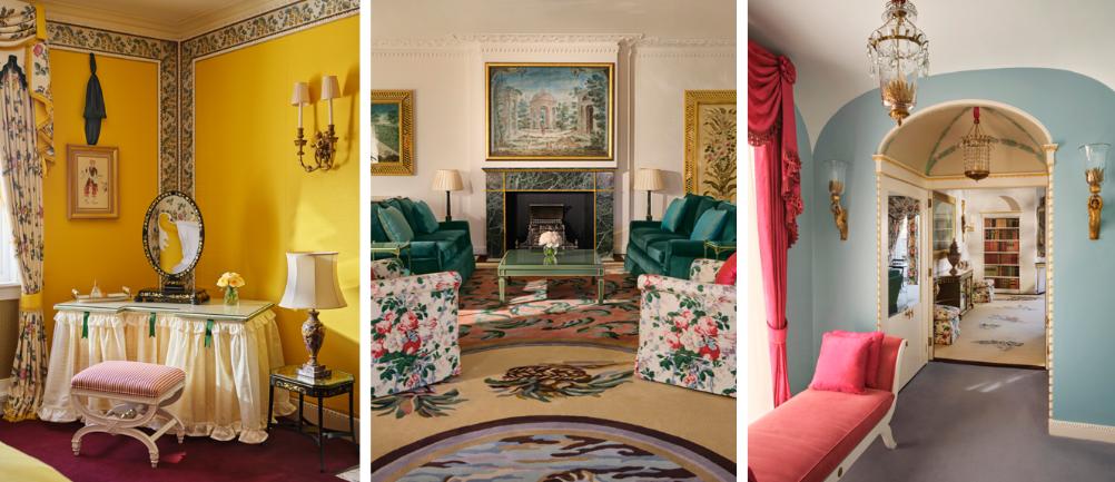 The floral silk wallcoverings, originally selected by Messel, were reissued exclusively for the suite by Sekers in collaboration with Sanderson Design Group. Other fabrics include azalea-pink silks and a re-woven imperial yellow Ottoman cloth for the bed canopy, produced in Italy.