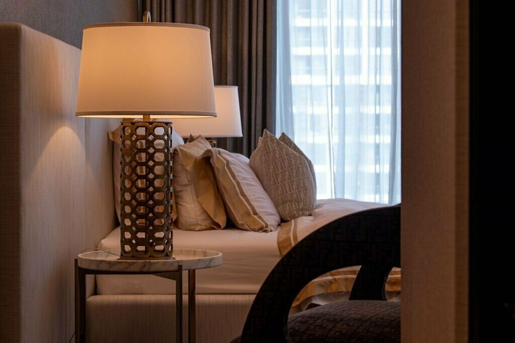 With meticulous attention to fine furnishings from FENDI Casa, the impressive and sleek fixtures of velvet and black marble are perfectly blended together with the muted color palette of mostly white, beige, and light brown, signifying the timeless, elegant and refined look as well as providing the luxurious feel. Every piece of FENDI Casa is inherently inspired by the fashion elements of FENDI, from the cushions that have the FF monogram and the iconic Villa Borghese horse embroidered or embossed to the sofas that have incorporated ‘the Selleria stitching’, the signature stitching of FENDI bags, on every corner. The furnishings, the furniture, and the decorative items all specially complement every living space, adding a final touch to complete the suite home fully and flawlessly to the world of luxury living.