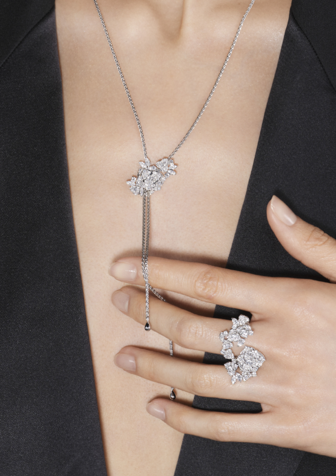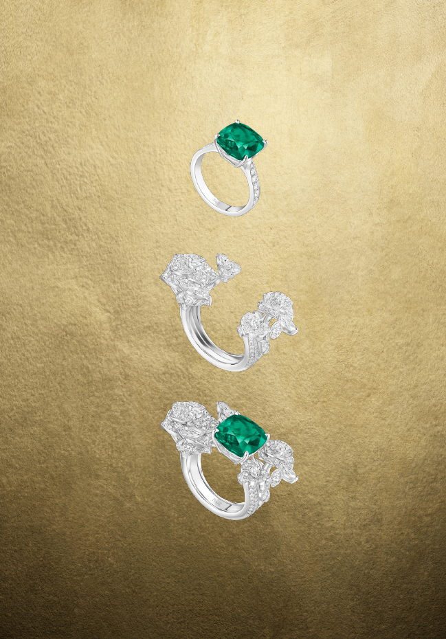 The Piaget Rose flourishes in the radiance of golden sunlight, an enduring inspiration to the Maison’s creativity and craftsmanship. This spring, a lively capsule collection presents a delectable bouquet of newly bloomed diamondset Rose jewels, with flashes of vibrant, leaf green emeralds. Poised between naturalism and abstraction, these are roses that grow in lush abundance from bud to blossom, spreading across the hand on between-the-finger rings, or climbing up around the ears, playfully mismatched with a single earring designed as marquise-diamond leaves clustered around a centre emerald.