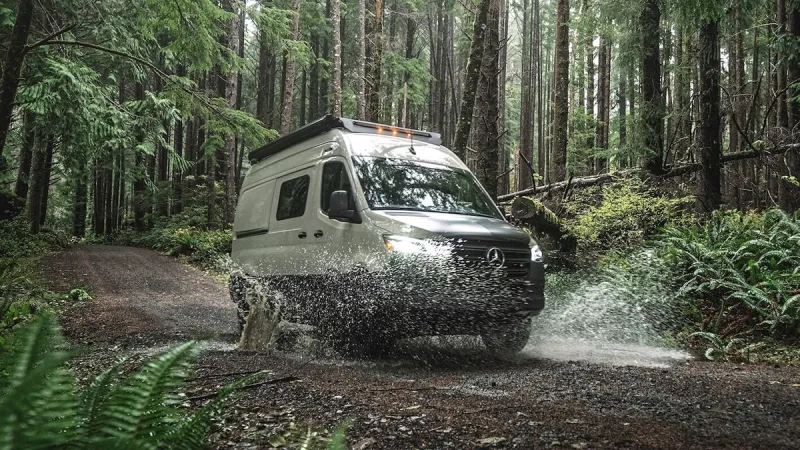 As impressive as the above camper van may be, you’re limited to campgrounds accessible via paved (or at the least relatively smooth) roads. For those who want more flexibility, there’s the off-road-ready Tiffin GH1. Based on the Mercedes-Benz Sprinter 2500, the vehicle stretches 19.5 feet bumper to bumper, but it still has room for an Adventure Bar workspace, pantry, wet bath with a hot shower, and a powerlift bed, with plenty of storage space below. A four-cylinder, twin-scroll turbo diesel that makes 208 hp and 332 ft lbs of torque, along with a set of “adventure" wheels wrapped in BFGoodrich all-terrain tires, ensure you’ll have little trouble navigating even the rough terrain. There’s also a 540-amp battery pack and a solar panel to keep everything up and running.