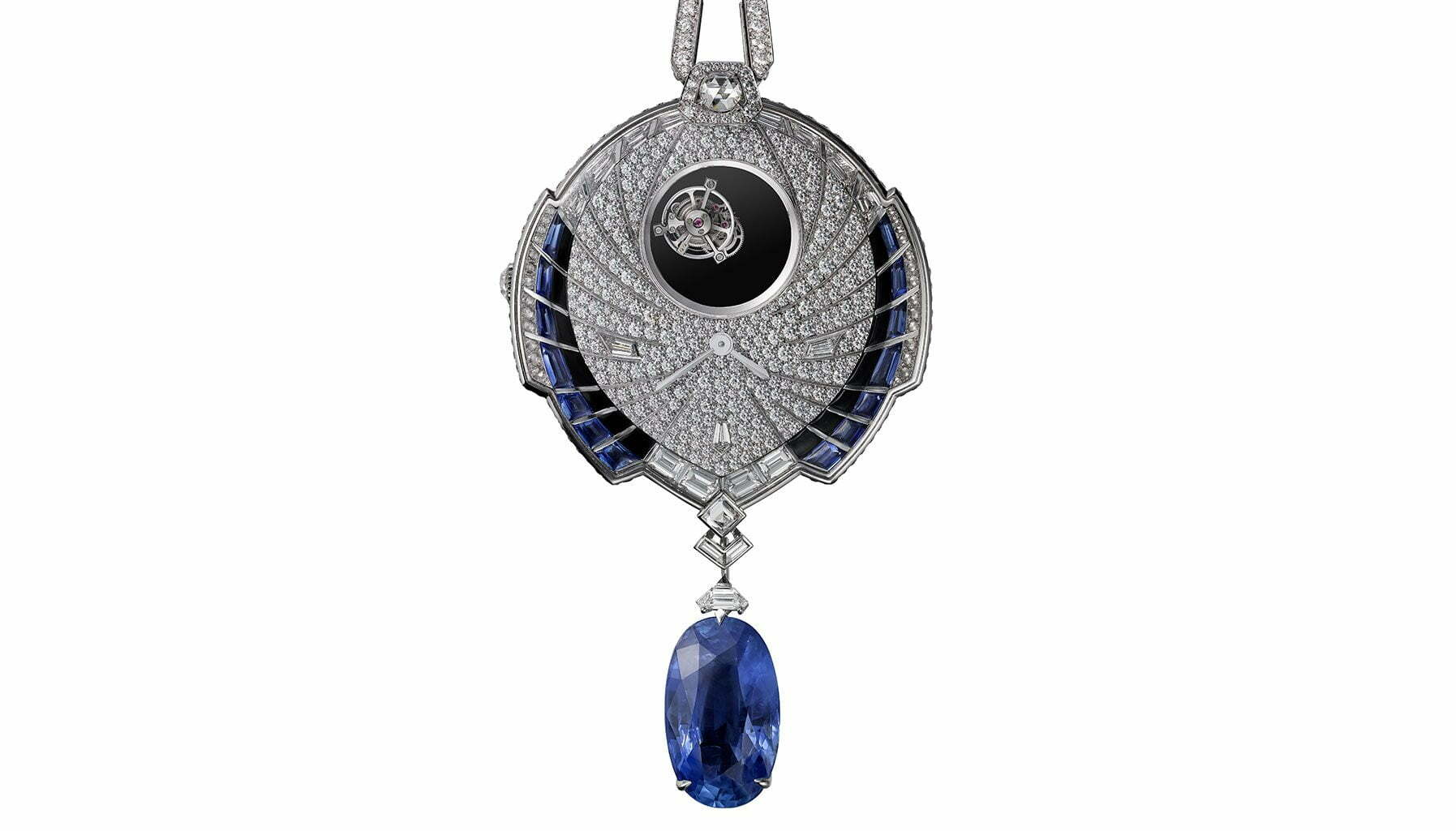 At first glance, one may mistake it for a pendant or one of Cartier’s secret watches. But a closer look reveals the rhodiumised steel hands camouflaged against a glittering backdrop of pave-set diamonds and sapphires arranged to subtly resemble butterfly wings. At 12 o’clock is the high complication feature that transforms this creation from a jewellery watch to an exemplary work of art that perfectly combines haute horlogerie and haute joaillerie – the double tourbillon of the calibre 9463MC. Carried between two sapphire crystals, it appears suspended in its little aperture.