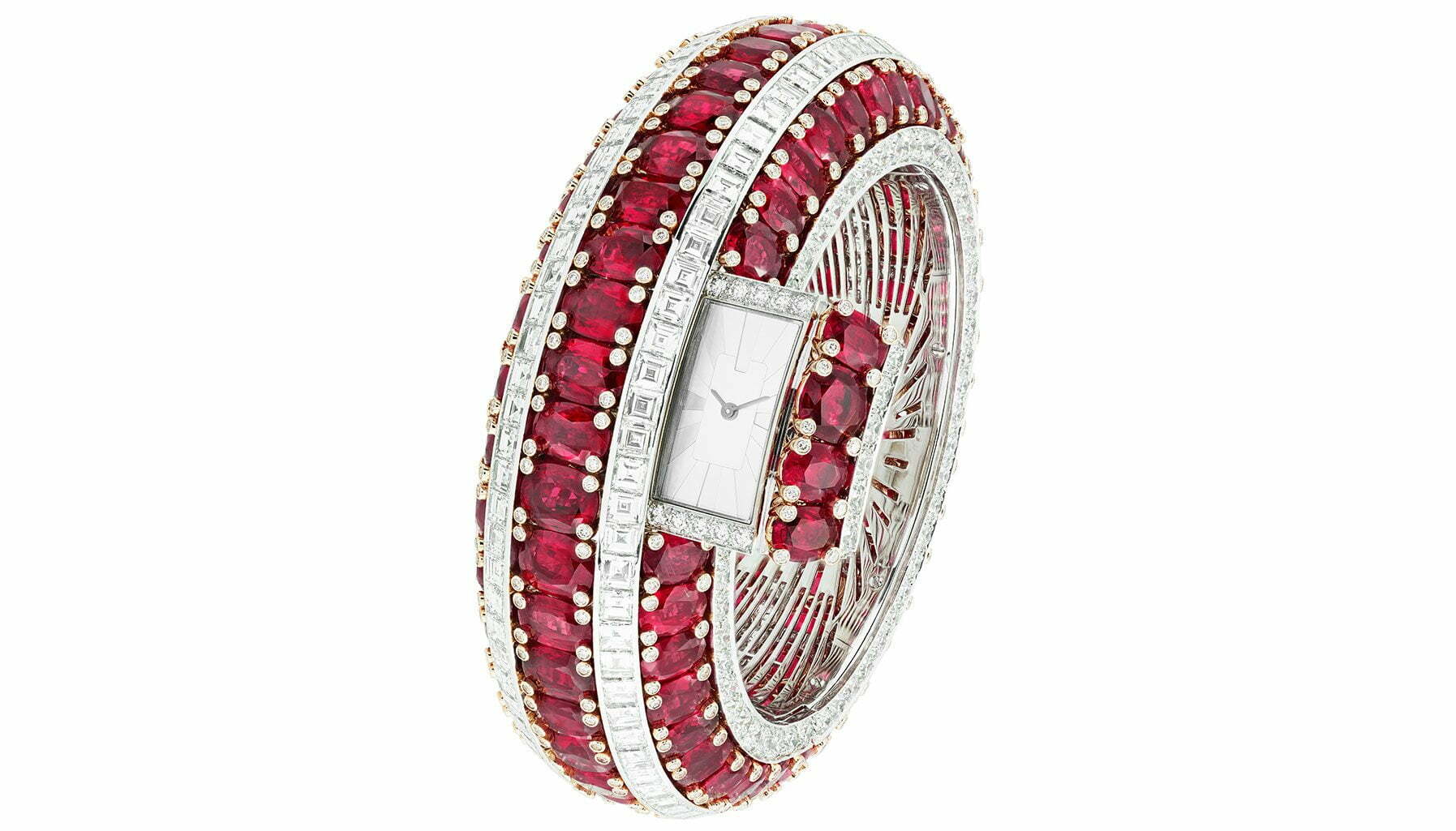 So precise is the mechanism that there is only 100th of a millimetre of tolerance between the drawer and the surrounding gemstones. It took an artisan a total of 1,500 hours to hand-set the diamonds and rubies – and years for Van Cleef & Arpels to find enough matching oval and cushion-cut rubies for this masterpiece.