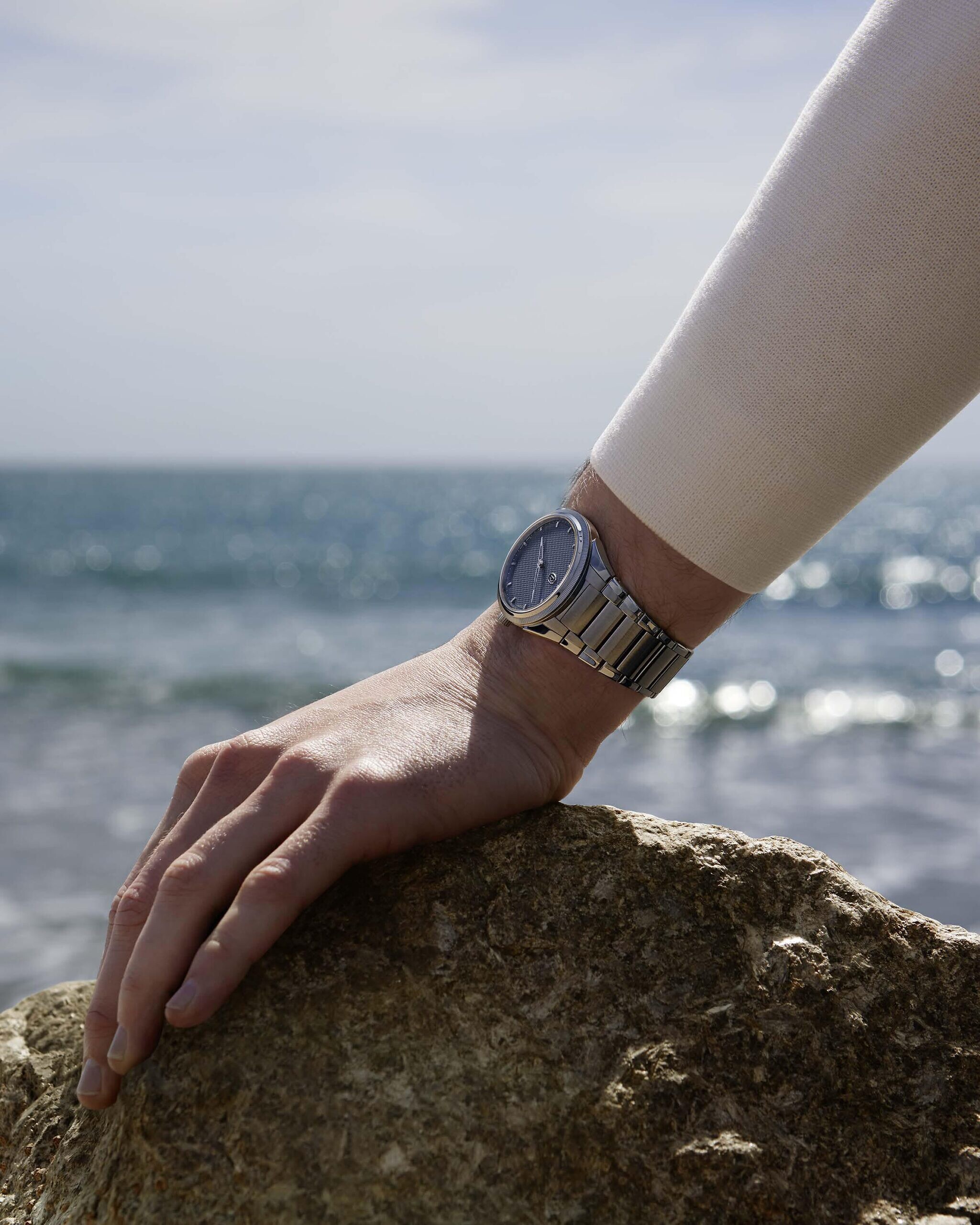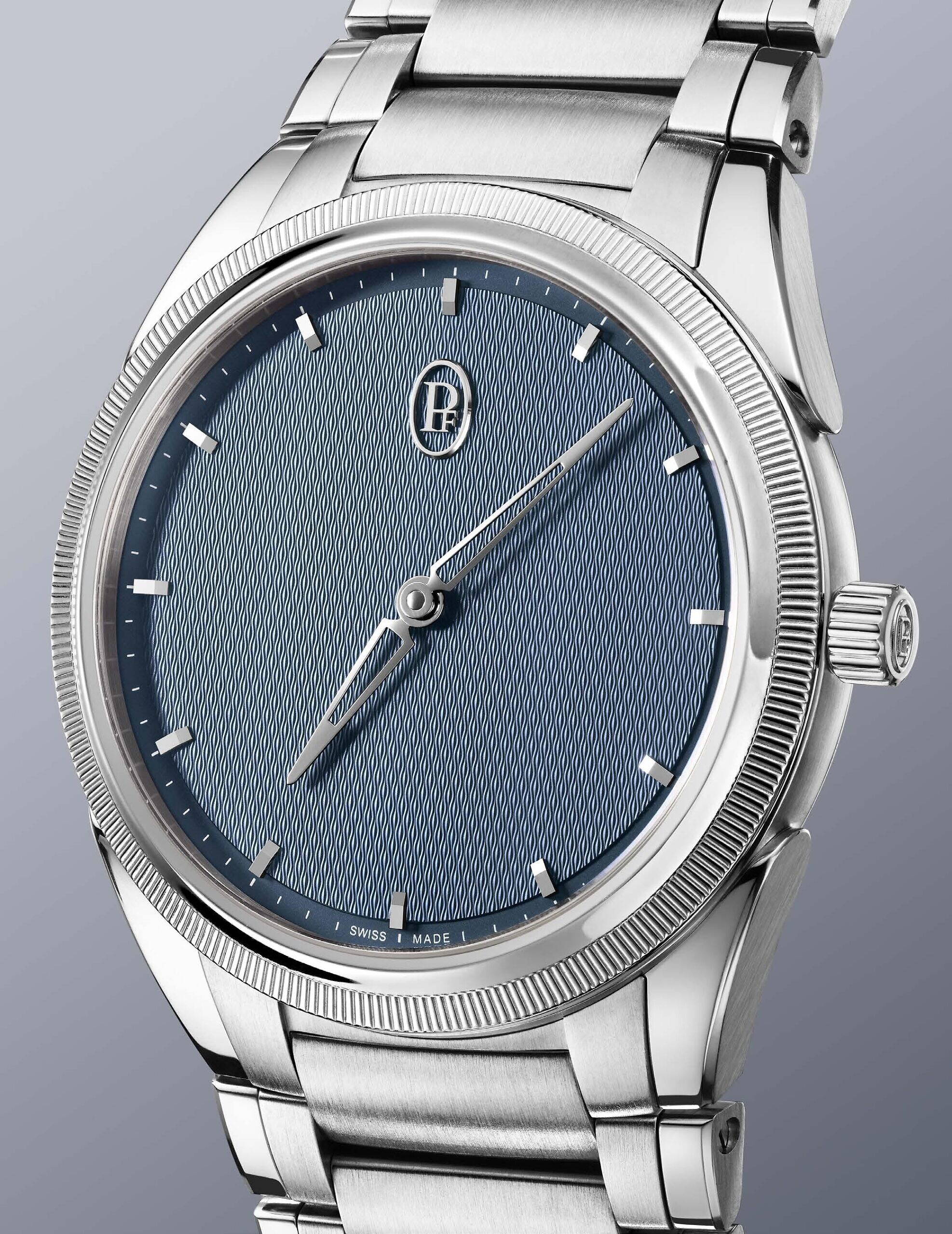 The beauty of the “Stone Blue" dial is enriched by remarkable artisanal craftsmanship. Finely guilloché in a Grain d’Orge motif, it captures light to create subtle plays of reflection, revealing a new facet of its delicate hue at every glance. This dial harmonizes perfectly with the knurled platinum bezel encircling the stainless steel case, a hallmark of the Tonda PF collection, while the hand-applied rhodium-plated gold indexes add a touch of refinement. This perfect balance between minimalist design and precious details makes the Tonda PF 36MM a symbol of discreet and timeless sophistication.