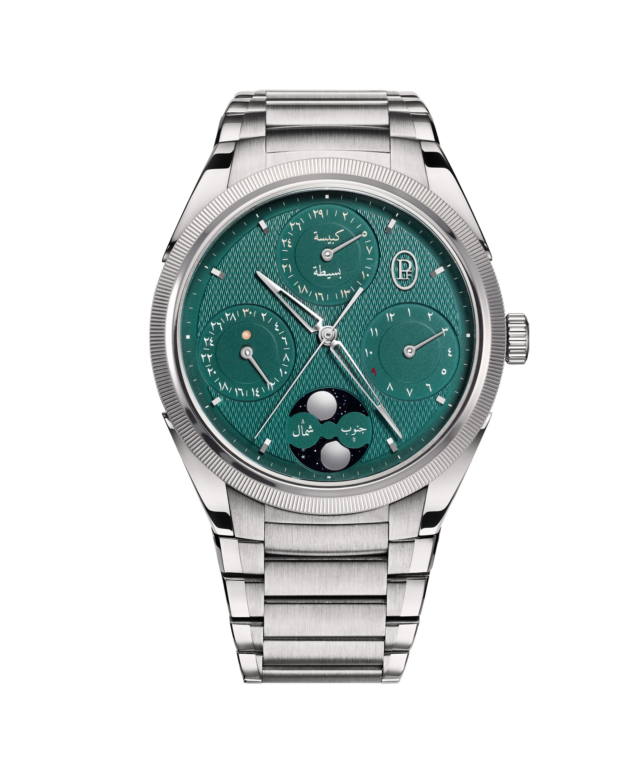Parmigiani Fleurier is renowned for its expertise in calendar complications, blending poetry with astronomical precision. The Tonda PF collection features three masterpieces: the complete Chinese calendar Xiali, the Western Gregorian calendar, and the Islamic Hijri calendar, showcasing a deep respect for cultural diversity and the complexity of time. Inspired by a pocket watch featuring an Arabic calendar, Michel Parmigiani created the Hijri Calendar Table Clock in 2011, later miniaturized into the Hijri Perpetual Calendar wristwatch, winning the 2020 Grand Prix d’Horlogerie de Genève (GPHG) Innovation Prize. In 2023, Parmigiani Fleurier released the Tonda PF Hijri Perpetual Calendar in platinum, and now introduces a new version in stainless steel with a vivid Viridian green dial. The Hijri Perpetual Calendar follows the Tabular Islamic calendar developed in the 8th century, marking the Prophet Muhammad’s migration from Mecca to Medina in 622 CE. It is a lunar calendar, differing from the solar Gregorian and lunisolar Chinese Xiali calendars, featuring a 30-year cycle with common and abundant years based on moon cycles.