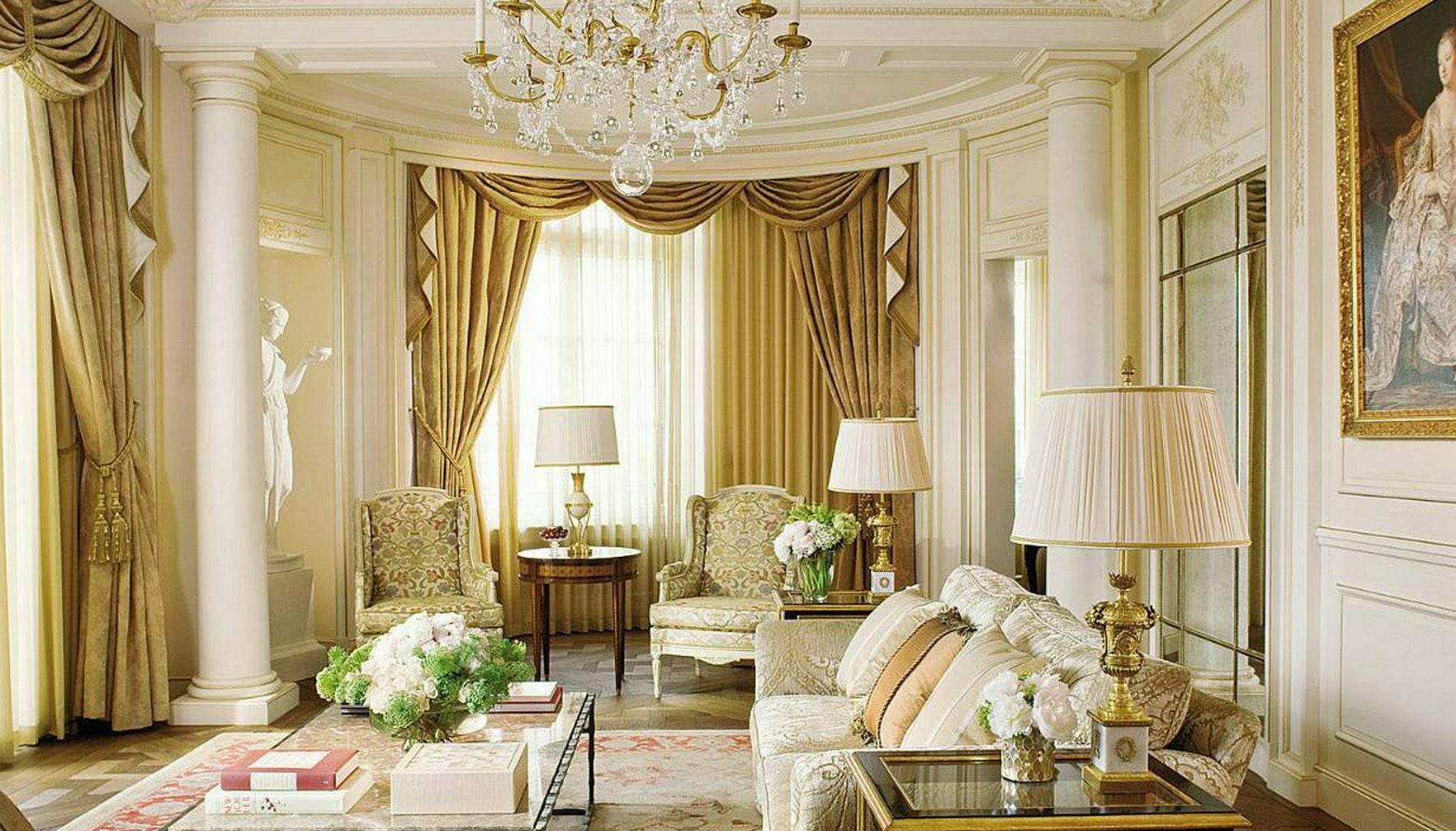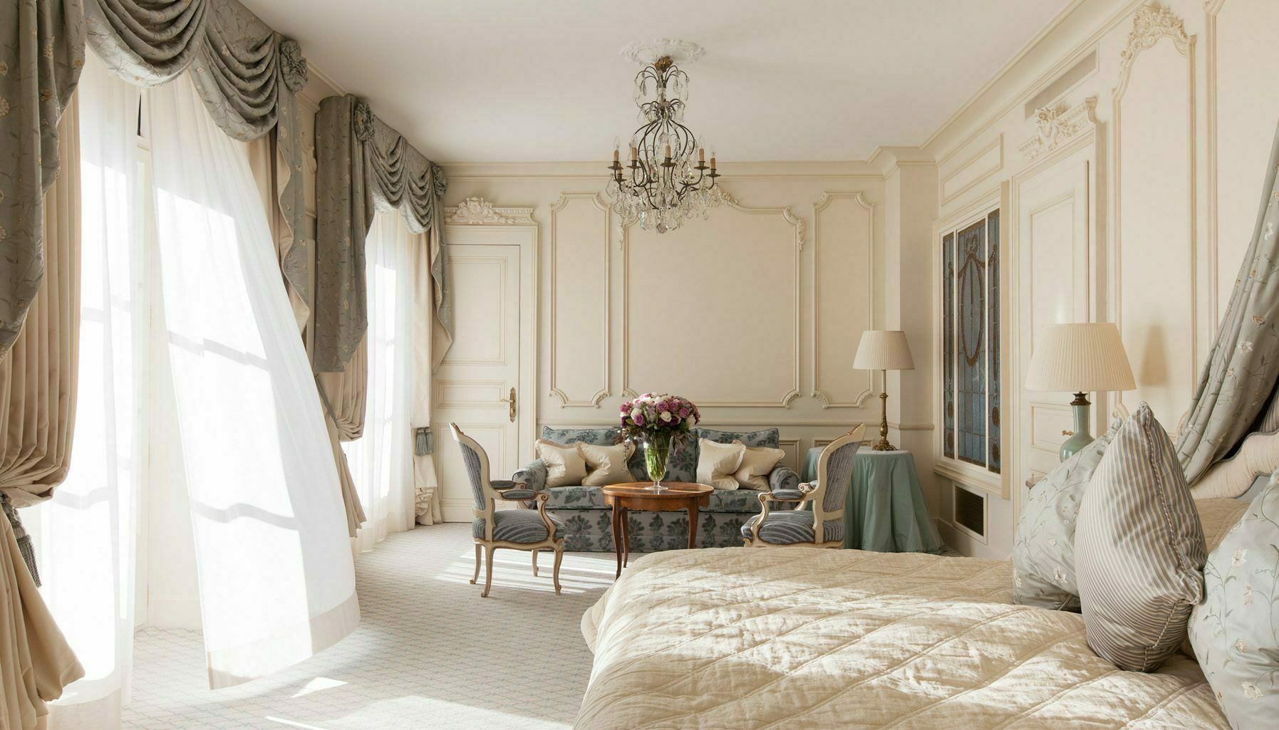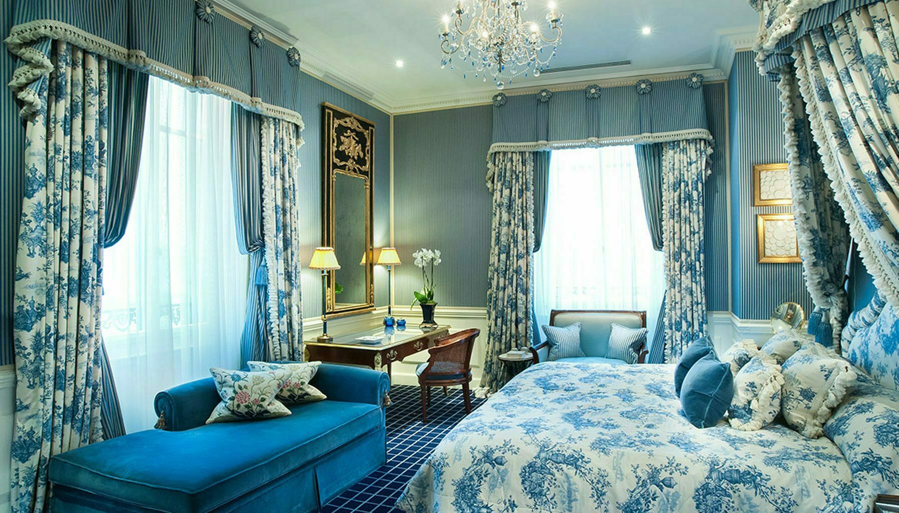 The 306sqm Royal Suite, designed by renowned interior architect Pierre-Yves Rochon, provides an extremely warm welcome with high ceilings and tall windows, allowing an abundance of natural light to flood the sleeping, dining, and living areas. With impeccable French furnishings echoing the style of Versailles, the suite has a spacious marble foyer, a living room with formal dining room that can accommodate up to eight guests, an adjacent pantry, a parlour and a high-tech office that doubles as a library.