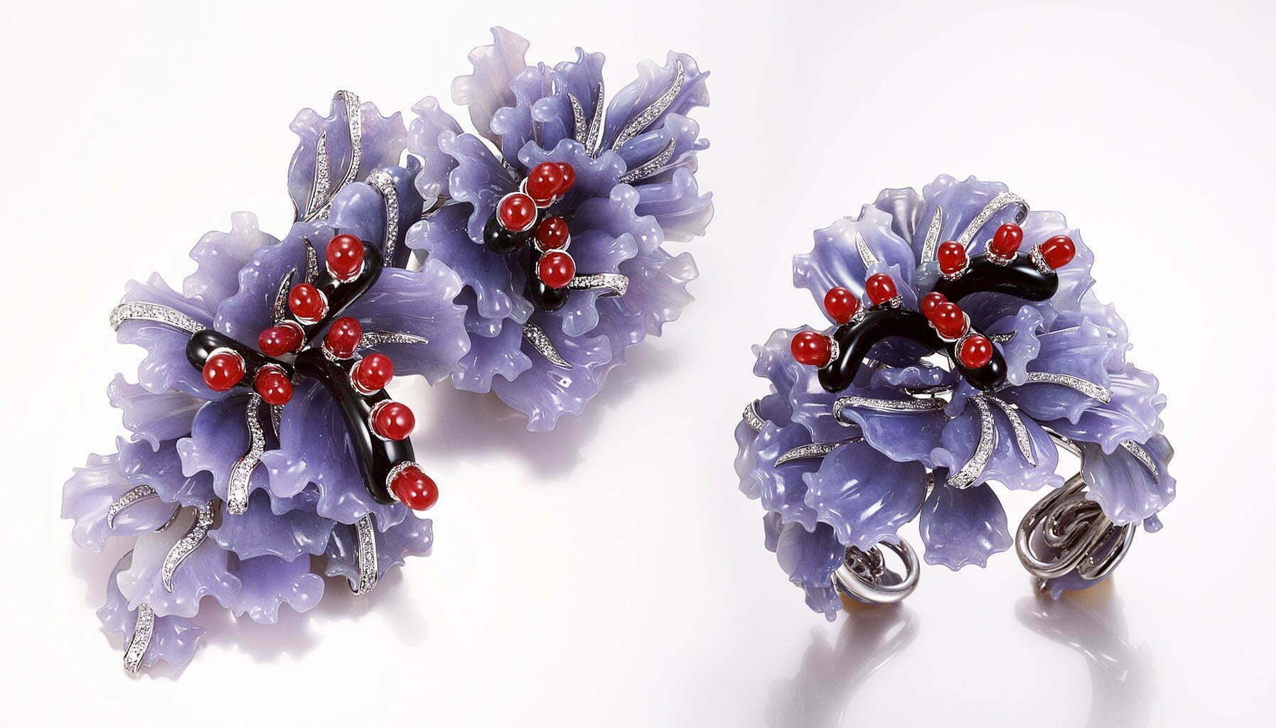 Apart from jade, Zhaoyi also works with colourless jadeite, and the rare black and lavender jadeite. In March 2015, Zhaoyi made its European debut at Baselworld with its stunning Imperial Classics collection. On display were bib and pendant necklaces, rings and earrings, featuring smooth jade cabochons, set with diamonds and coloured gemstones. Some of these haute couture offerings also showcased the millennia-old tradition of gold filigree inlay art.