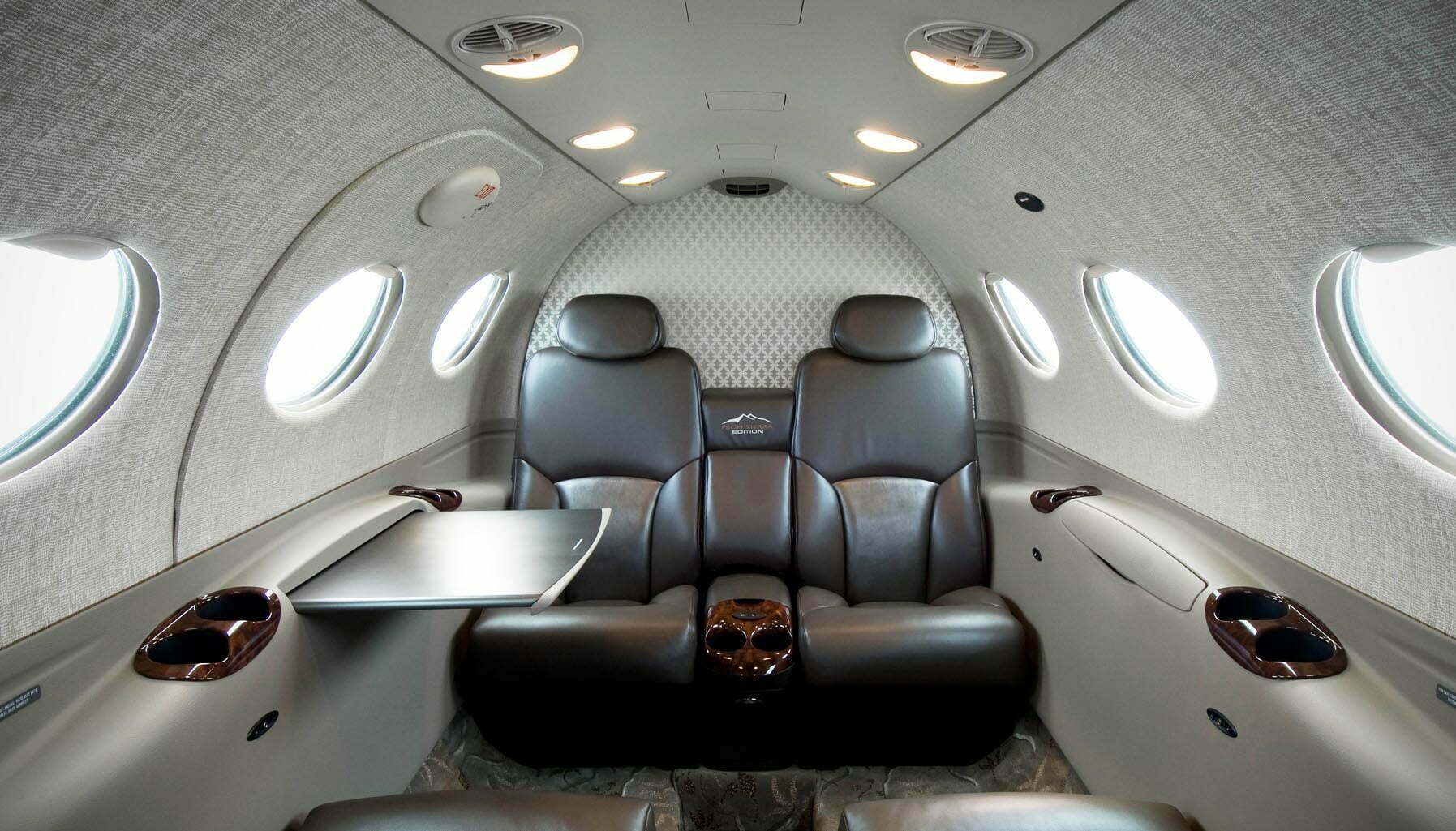 The Citation Mustang’s interior comes in Swish Nordic or Black Diamond, both of which include pile wool carpeting and luxurious leather seats. Foldaway tables, two 12-volt electric outlets, and in-cabin storage space cater to sky-high business needs, while a side-facing toilet with privacy curtain and optional SiriusXM satellite radio up the comfort factor. At a cabin length of 9ft 9in (3m), width of 4.6ft (1.4m) and height of 54in (1.37m), it’s not the most spacious interior, but does its job.