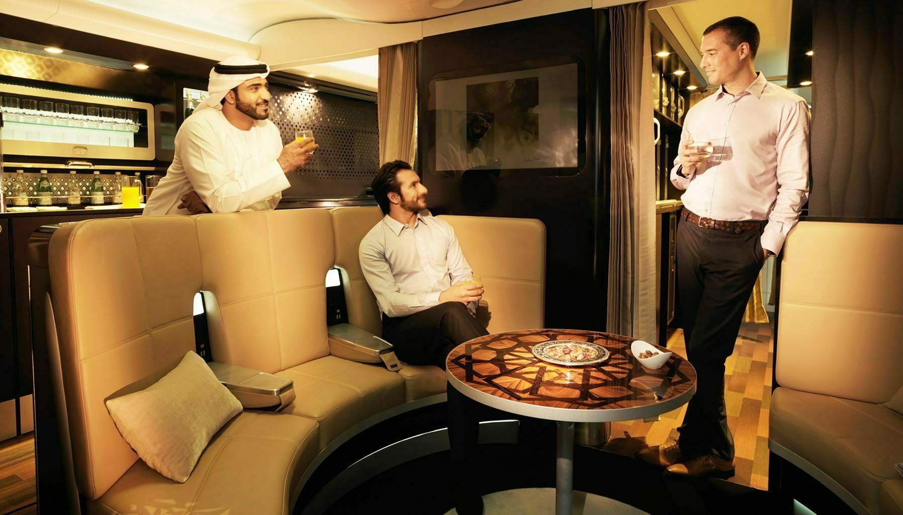 The living room comes with an ottoman that hides a minibar and additional storage areas. Watch a movie on the 32-inch flat-screen TV, enjoy a beverage from the drinks cabinet, or have a meal specially prepared by the in-flight chef. A personal butler is also on hand to ensure all arrangements itineraries are in place, both in- and post flight.