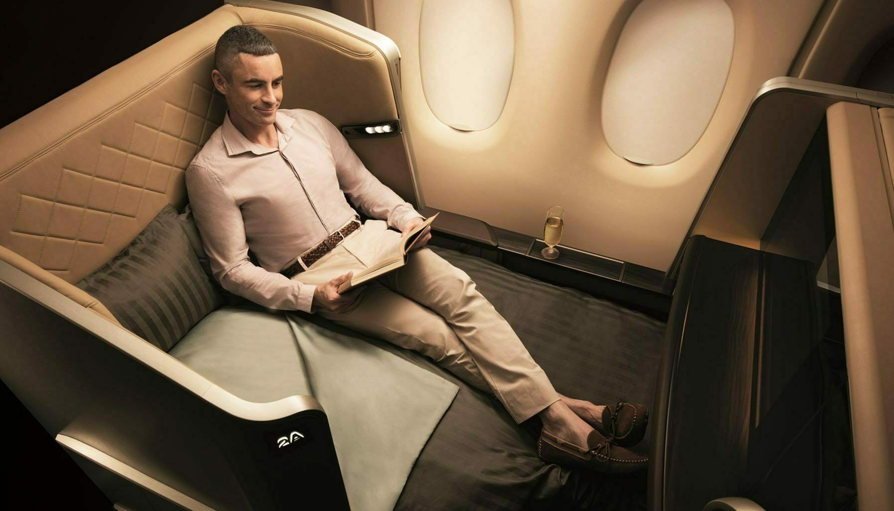 Each Suites cabin is a world of its own, featuring sliding doors and window blinds to ensure optimal privacy. A massive Italian leather armchair and ottoman await, along with a 23-inch television screen, Bose noise-cancelling headphones, Givenchy sleepwear, and an array of Salvatore Ferragamo toiletries.