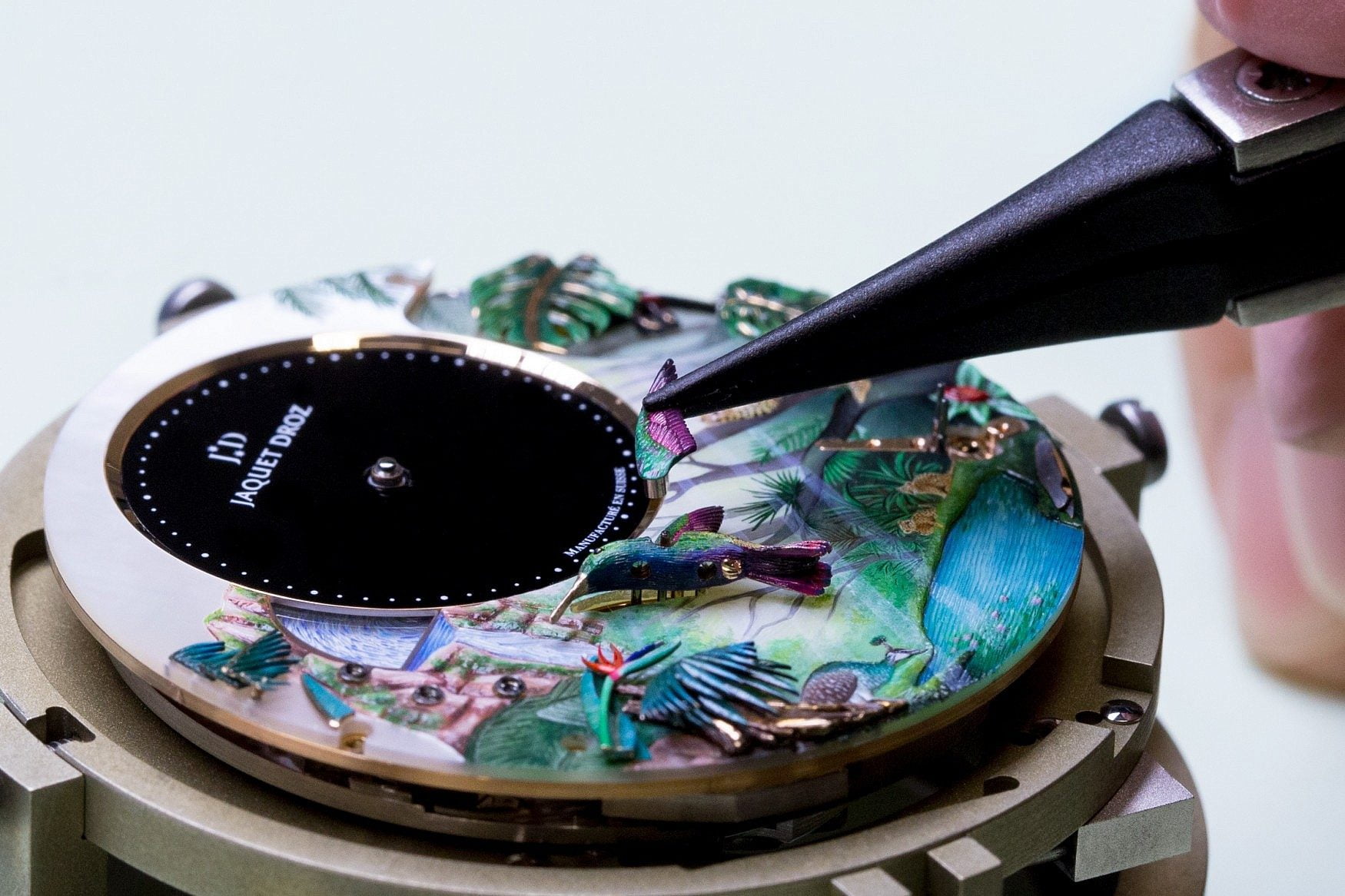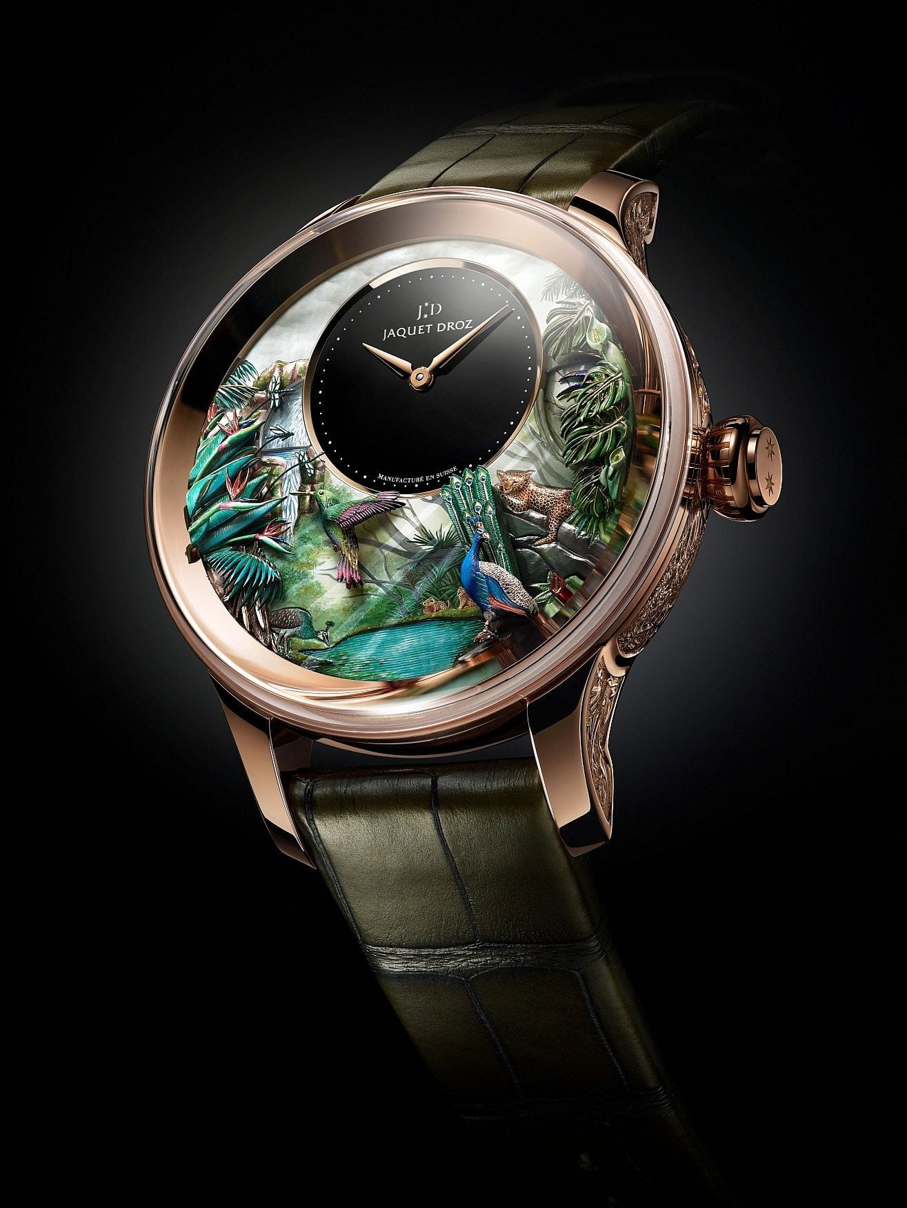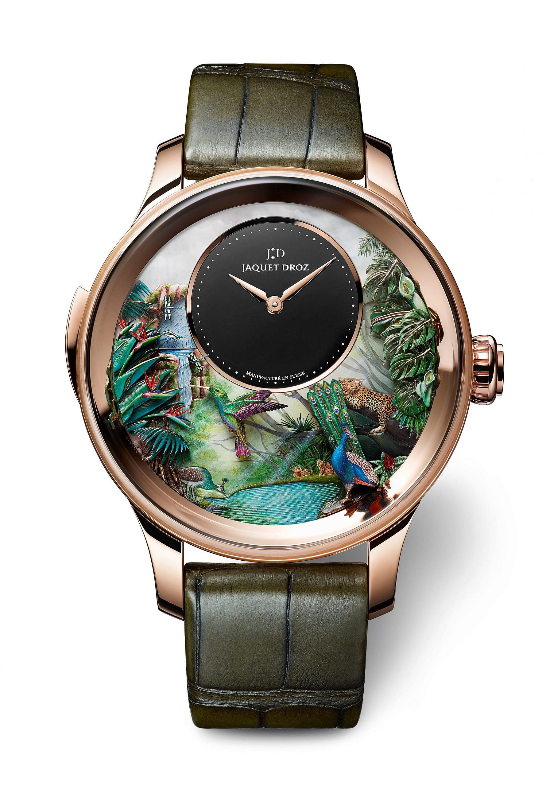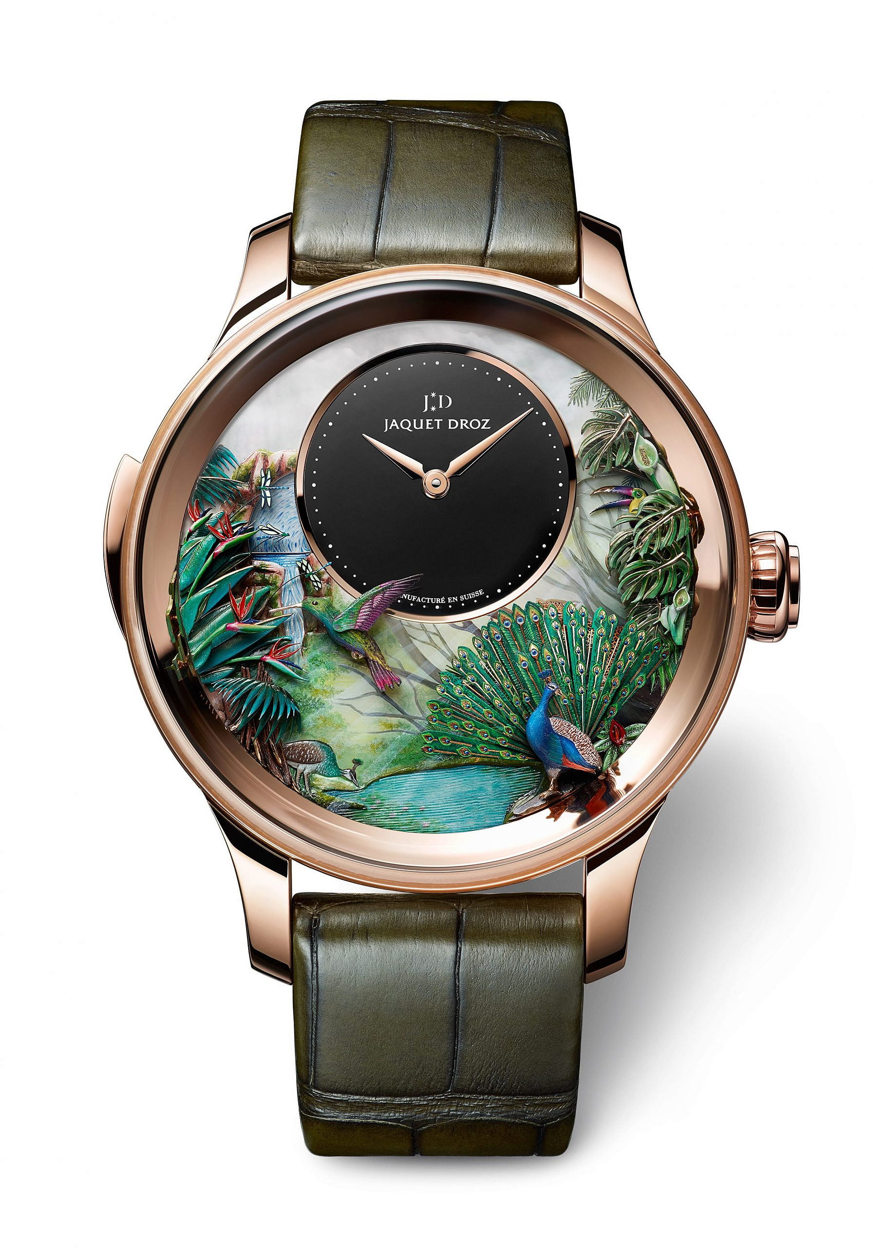 As part of its line of exceptional automaton watches presented since 2012, Jaquet Droz unveils a new model inspired by a tropical landscape. With a shiny case of either red or white gold in 18k, 47.0 millimeters, the body and joints of the watch have been meticulously engraved by hand. Only a limited number of eight for each metal have been produced.