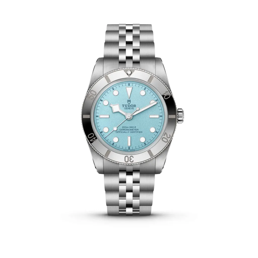 Tudor’s newest Black Bay 54 iteration continues to capitalize on the uber-popular turquoise trend in watches. The aptly named “Lagoon Blue" is based on the first Black Bay that was released in 2023, but now comes with a few important upgrades. The dial showcases a new summery hue and a novel sand-like texture, while the original three-link rivet-style bracelet has been updated to a five-link Jubilee style. The bracelet and bezel are both mirror-polished for extra contrast. Other signatures, like the 37 mm case and “Snowflake" white hands, remain. The piece costs CHF 3,900 or about $5,000.