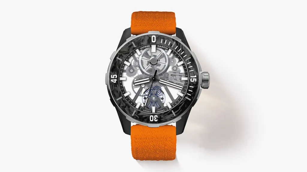 Ulysse Nardin’s next-generation dive watch has three major flex points: it’s a skeletonized dive watch that is water-resistant to 200 meters; it’s made mostly of recycled materials; and it’s the world’s lightest mechanical dive watch. The Diver [Air] is less than half the weight of its predecessor, the Diver X Skeleton, introduced in 2021. The case material goes a long way to achieving the featherweight status: it’s made of a special carbon fiber called Nylo®-Foil, a blend of 60% Nylo® and 40% carbon fiber, making it lighter than traditional carbon fiber. It’s combined with a titanium middle case, which is what ensures the 200-meter water resistance. Nylo® is made from recycled ocean netting, and the titanium is 90% recycled. The bezel insert is made of CarbonFoil, 100% upcycled carbon fibers from IMOCA sailing yachts, chopped and compressed into a marble-like pattern. Even the escapement is recycled. It is produced from an upcycled silicon wafer supplied by Sigatec, a Swiss movement component maker. The automatic UN-374 is new, created by removing as much material as possible, and by using titanium for some of the components to keep it stable and light. UN says it can withstand an impact of 5,000 gauss. The bridges are only a few millimeters wide, and are hollowed out to save weight. The mainspring barrel was reconfigured into a flying arrangement to reduce the mass of the top bridge. It comes with two ultralight, elasticated straps in white and orange