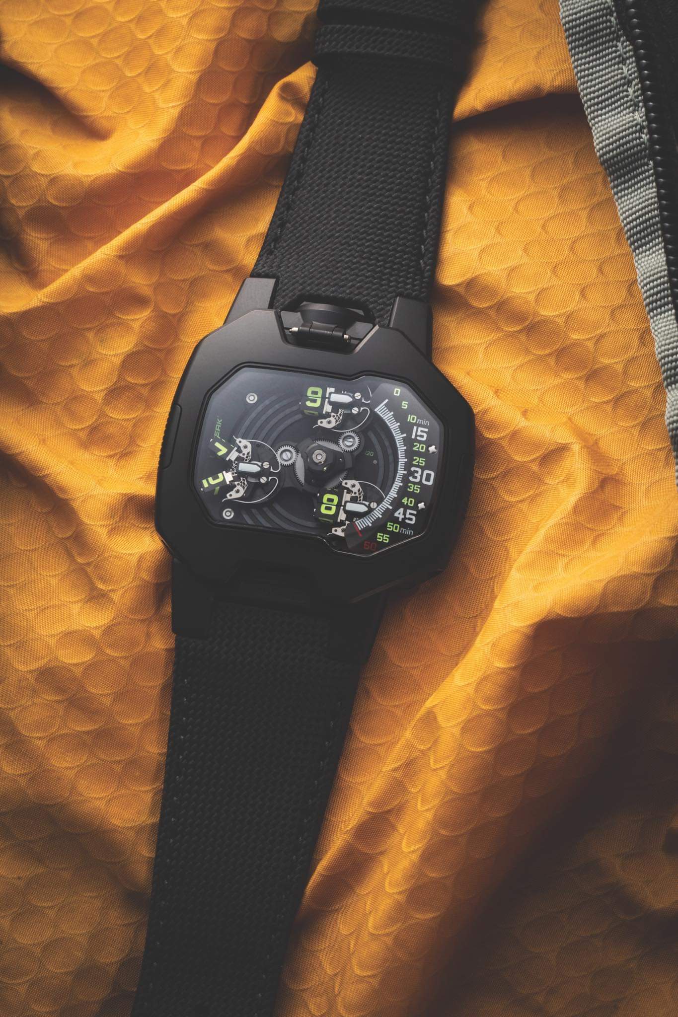 นับตั้งแต่ก่อตั้ง Urwerk ในปี 1997 นาฬิกาล้ำสมัยของบริษัทซึ่งมีรูปทรงตัวเรือนที่แหวกแนวและการจัดแสดงชั่วโมงที่เร้าใจอย่างดุร้าย มักดูเหมือนยานอวกาศสำหรับสวมข้อมืออยู่เสมอ เวลาจะแสดงผ่านบล็อกชั่วโมงที่หมุนได้สามบล็อกซึ่งสอดคล้องกับส่วนโค้งนาที รุ่นเก่า เช่น UR-110 มาพร้อมกับกล่องหนาเพื่อรองรับบล็อกกลึงที่กว้างที่สุด ความมหัศจรรย์ทางวิศวกรรมล่าสุดทำให้ระบบนี้เล็กลง โดยลดขนาดตัวเรือนจาก 47 มม. x 51 มม. x 17 มม. ของ UR-110 เหลือขนาด 47 มม. x 44 มม. x 15.8 มม. ที่สามารถสวมใส่ได้มากขึ้น นอกจากนี้ ยังมาพร้อมกับตัวเชื่อมที่ยืดหยุ่นและตัวเรือนไทเทเนียมพ่นทรายสีดำขาวดำพร้อมขอบตัวเรือนเหล็กพ่นทราย เคลือบด้วย DLC และเคลือบซิลิกอน