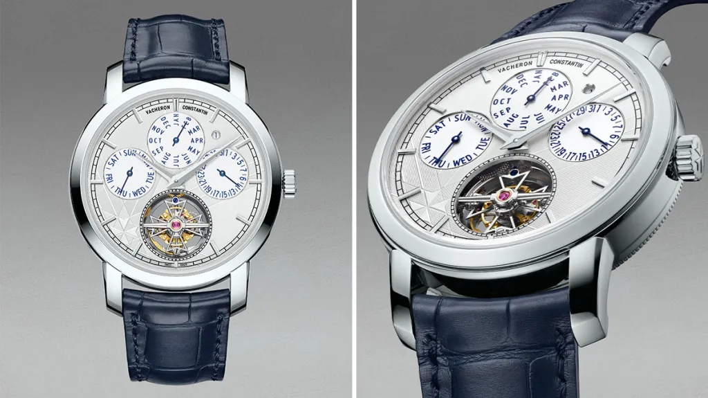 2025 marks 270 years of watchmaking at Vacheron Constantin. In celebration of this significant milestone, the brand is launching the Traditionnelle Tourbillon Perpetual Calendar, a 42mm platinum QP powered by a new automatic manufacture caliber. Measuring 11.1 mm thick, its classic shape is fitted with a hand-guilloché dial in a signature motif signifying its status as a 270th-anniversary limited edition. With an outer chemin de fer minutes track, a month indicator at 12 o’clock, a date indicator at 3 o’clock, a day indicator at 9 o’clock, a leap year indicator at 1:30, and a tourbillon spinning away above 6 o’clock, one would imagine the dial would feel crowded—alas, this is not the case, as its ample size and excellent use of negative space make it distinctly legible.