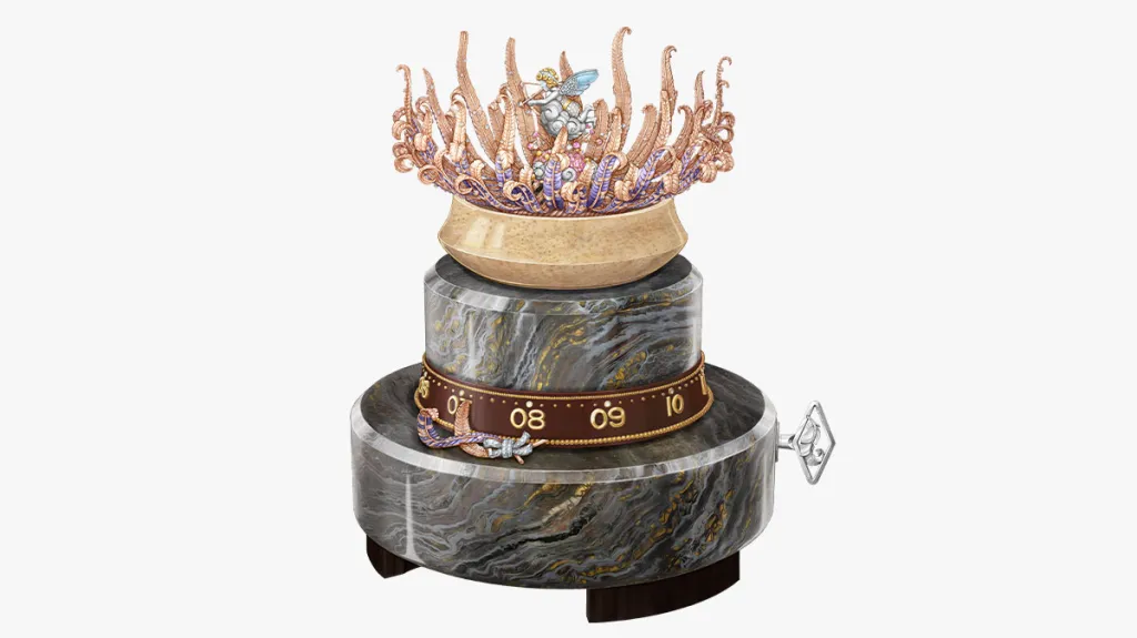 Designed in partnership with famed Swiss automaton maker, François Junod in his studio inthe hills of Sainte-Croix, Switzerland, this table clock is smaller than the Planètarium, but no less special. Its base is crafted from iron eye stone, known for its golden striations. A petrified palmwood bowl cradles the undulating laquered feathers that open to reveal a white gold, rose gold, and yellow gold cupid with plique-à-jour wings that emerges to the tune of a carillon melody and spins around. Cupid floats above clouds rendered in white gold, diamonds, and pink sapphires.