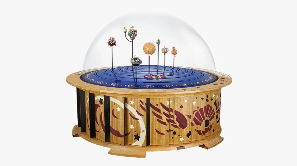 It’s a beautiful work of art, but it’s also a wonder of engineering. Its complex mechanical movement moves each gem-set body at its actual heavenly rotation speed: Mercury completes its orbit in 88 days, Venus in 244, Earth in 365, Mars in 687, Jupiter in 11.86 years and Saturn in 29.5 years. The moon revolves around the Earth in 27.3 days. Of course, an on-demand activation sets the stars into motion whenever the owner pleases. All of this comes to life beneath a custom hand-blown glass dome.