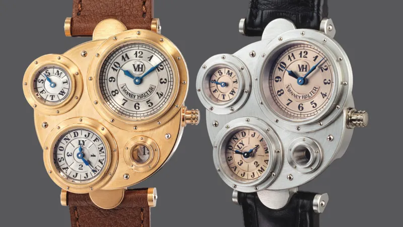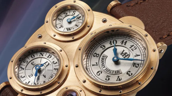 Vianney Halter represents the genesis of modern independent watchmaking that cuts against the grain. His initial creation, the Antiqua, changed the game when it was released in 1998 thanks to its wholly original layout and construction. The watch is a perpetual calendar that sets its functions into its own subdial structures emanating from the case. The unusual design was developed in collaboration with American graphic designer Jeff Barnes and brought to life by Halter in gold and platinum. Inside sits a Lemania 8810 base caliber that’s been thoroughly revised by Halter to suit the needs of the innovative layout.