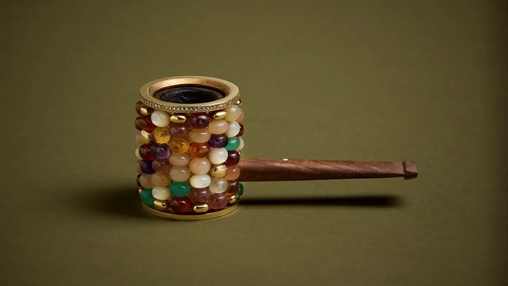 First among the brands commissioned by Anderson was English brand Dunhill, who designed a pipe specifically for the film’s plot as a gift passed from Zsa-zsa Korda (Benicio del Toro) to his 21-year-old daughter Liesl (Mia Threapleton), . Drawing on Dunhill’s own storied history in pipe-making, which dates back to the early 20th century, the design reimagines a classic American corn cob pipe in miniature, adorned with hand-cut semi-precious stones and framed in 18-carat gold. Equal parts prop and objet d’art, it fits seamlessly into Anderson’s meticulously crafted world.