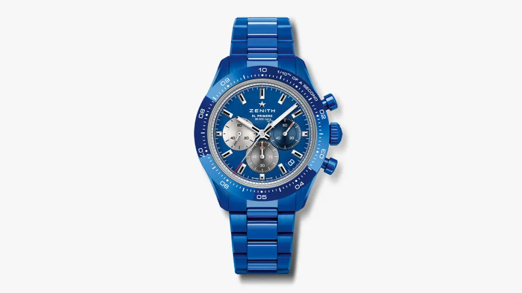 The final entry in the Zenith 160th Anniversary Edition blue enamel trifecta is the Chronomaster Sport, the brand’s Daytona-esque triple-register chronograph introduced back in 2021. Likewise executed in blue ceramic, its 41 mm case features an engraved bezel with a 1/10th-seconds track in white printing. Dual pump pushers and a prominent crown allow one to control the watch’s triple-register chronograph, which is artfully displayed on the dial via dark blue, dark grey, and light grey totalizers. A 4:30 date window matches the dial’s blue background, while applied indices and a luminescent sword handset completes the vintage El Primero-inspired look.
