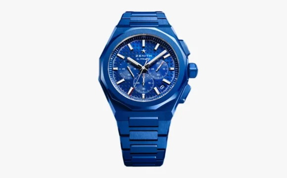 The final entry in the Zenith 160th Anniversary Edition blue enamel trifecta is the Chronomaster Sport, the brand’s Daytona-esque triple-register chronograph introduced back in 2021. Likewise executed in blue ceramic, its 41 mm case features an engraved bezel with a 1/10th-seconds track in white printing. Dual pump pushers and a prominent crown allow one to control the watch’s triple-register chronograph, which is artfully displayed on the dial via dark blue, dark grey, and light grey totalizers. A 4:30 date window matches the dial’s blue background, while applied indices and a luminescent sword handset completes the vintage El Primero-inspired look.